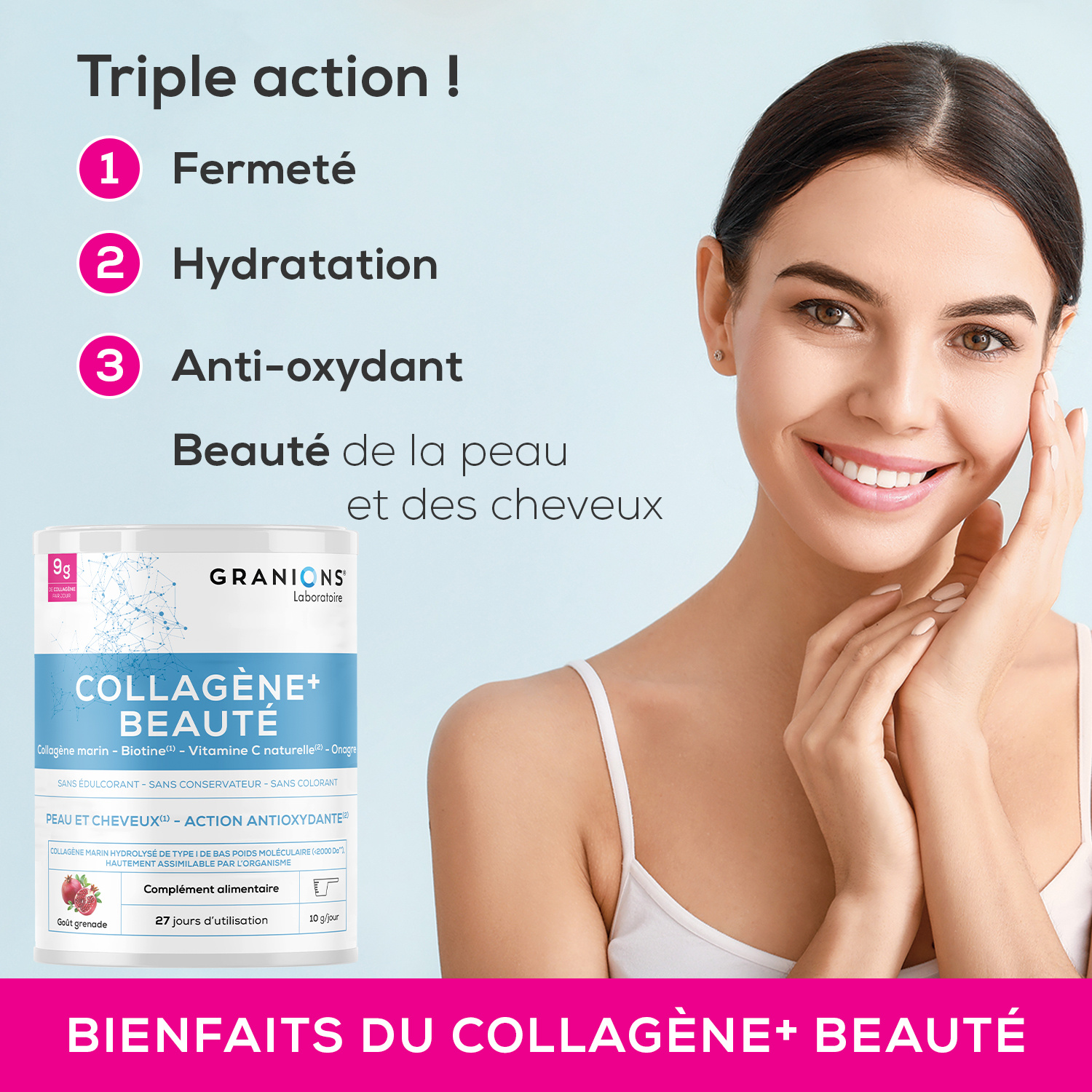 Granions Collagène+ Beauté 275 g est un complément alimentaire à base de collagène marin, biotine, vitamine C naturelle et bourrache. Le collagène marin de type I de bas poids moléculaire hautement dosé, est très assimilable par l'organisme. La biotine contribue au maintien d'une peau normale et de cheveux normaux. L'huile d'onagre et de bourrache microencapsulées complètent la formule. La vitamine C naturelle, issue de l'acérola, contribue à protéger les cellules contre le stress oxydatif et contribue à la formation normale de collagène pour assurer une fonction normale de la peau. Le jus concentré de grenade et la betterave complètent la formule. L'acide hyaluronique, molécule avec un fort pouvoir hydratant présente dans les tissus conjonctifs est reconnue pour améliorer la tonicité et la fermeté de la peau. Goût grenade. Le pot permet de réaliser 27 portions journalières. Sans édulcorant, sans conservateur, sans colorant.