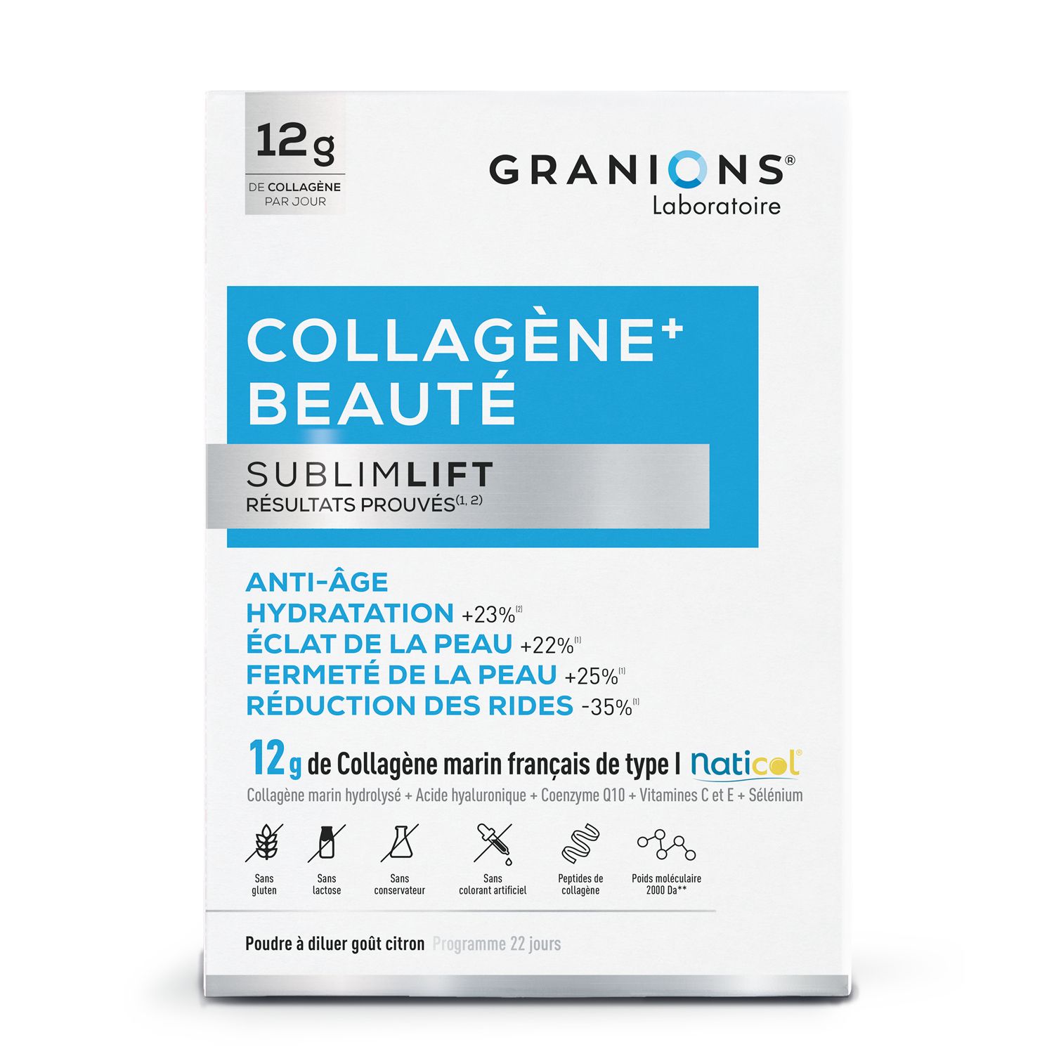 Details POURQUOI LE COLLAGÈNE + BEAUTE GRANIONS ? Le Laboratoire des GRANIONS a développé un complexe à base de Collagène en poudre hautement concentré et d’acide hyaluronique. L’association de la Vitamine C, puissant antioxydant et de la Biotine, qui contribue à la beauté de la peau et des cheveux, complètent la formule pour une action optimale.
