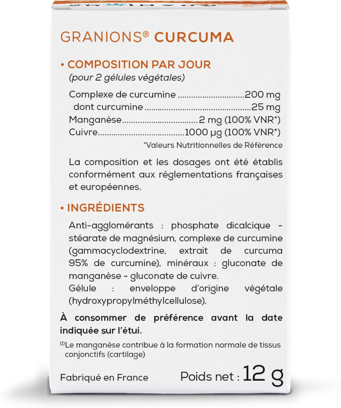 Depuis 1948, le Laboratoire des Granions est le spécialiste des oligoéléments unitaires, spécialités dont il a tiré son nom (grains d'ions). Aujourd’hui il étend son savoir-faire à des actifs innovants, reconnus pour leurs bénéfices et en adéquation avec les dernières avancées scientifiques. Le Laboratoire pharmaceutique des Granions s’inscrit dans une démarche de haute qualité et de sécurité : maitrise des matières premières, contrôle de la qualité, dosages conformes aux législations françaises et européennes, traçabilité… Ainsi, le Laboratoire des Granions confirme sa mission première : vous proposer des actifs spécifiques, à l’état unitaire, pour vous apporter une efficacité ciblée et personnalisée. Granions curcuma 40 fois plus biodisponible que le Curcuma standard. Granions curcuma contribue à la formation du cartilage (Manganèse). Le manganèse contribue à la formation normale de tissus conjonctifs (cartilage).