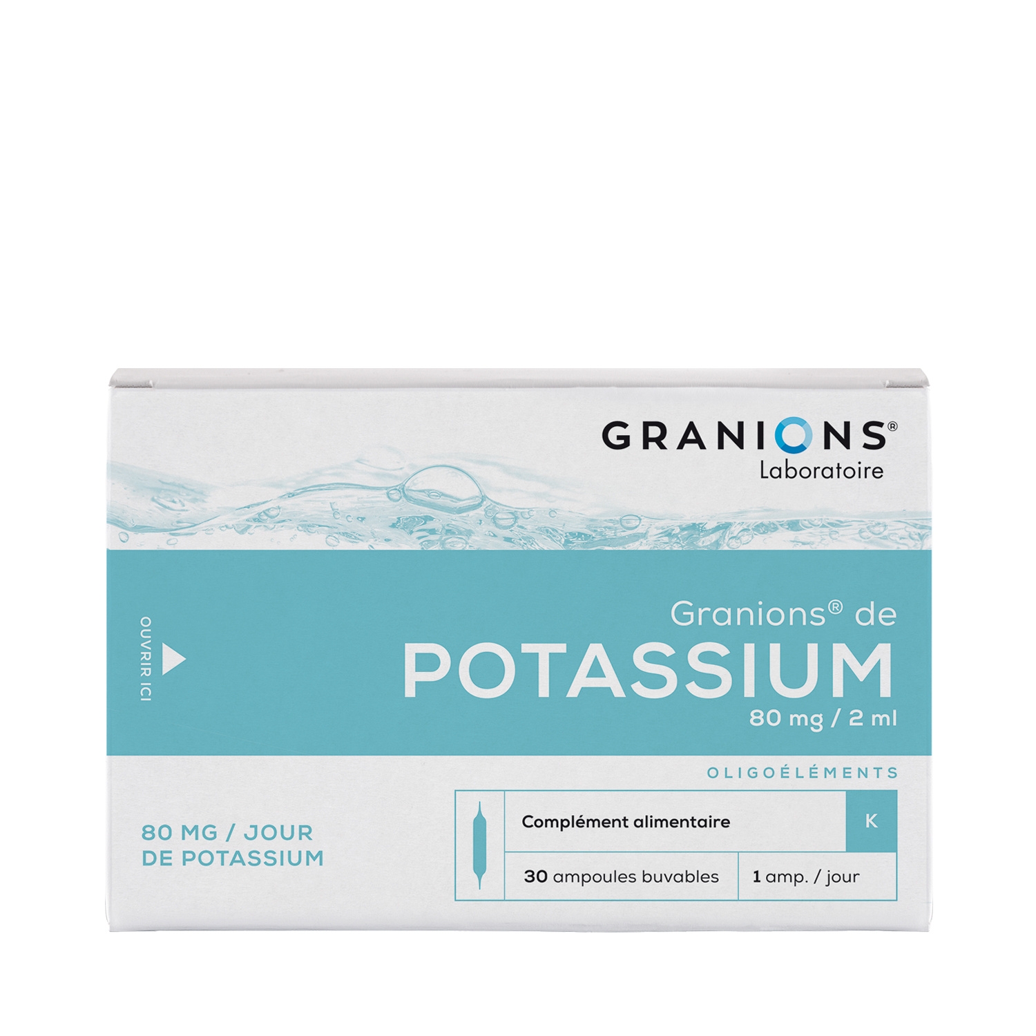 Les Ampoules Granions de Potassium du Laboratoire des Granions est un complément alimentaire sous forme de solution buvable enrichie en potassium, à raison de 80mg/jour. Une complémentation en potassium est notamment recommandée aux personnes souffrant de crampes ou de douleurs musculaires. L’apport de potassium est également bénéfique aux personnes qui ont une alimentation trop acide, aux hypertendus et aux sportifs.