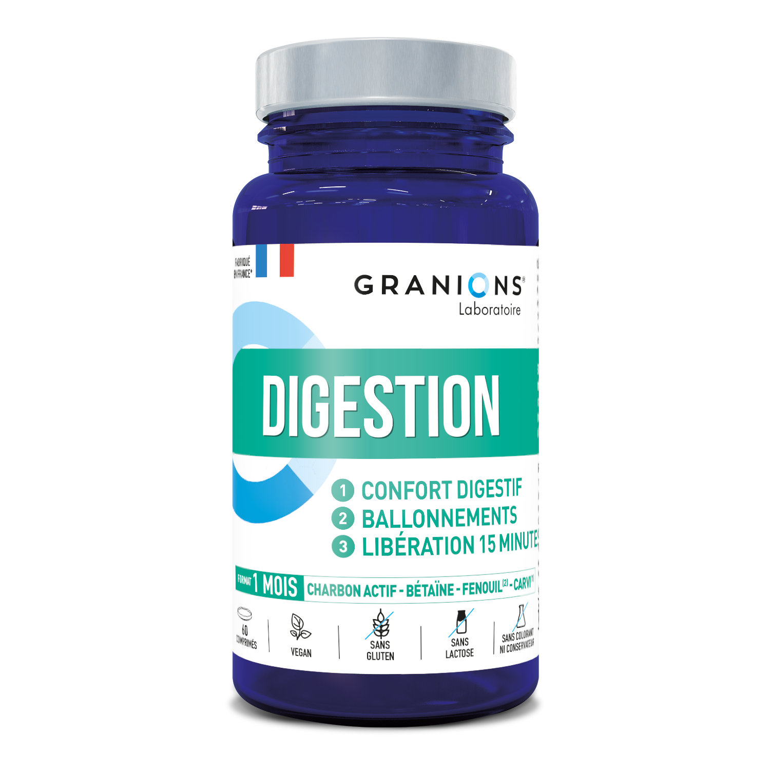 Le DIGESTION de Granions est un complément alimentaire dédié au confort digestif. Ce produit contient une association unique de charbon et de bétaïne. La formule est complétée par du carvi qui stimule la digestion et aide à limiter les inconforts digestifs ainsi que du fenouil qui contribue au bien-être en cas de ballonnements et de flatulences. Le calcium contribue au fonctionnement normal des enzymes digestives.