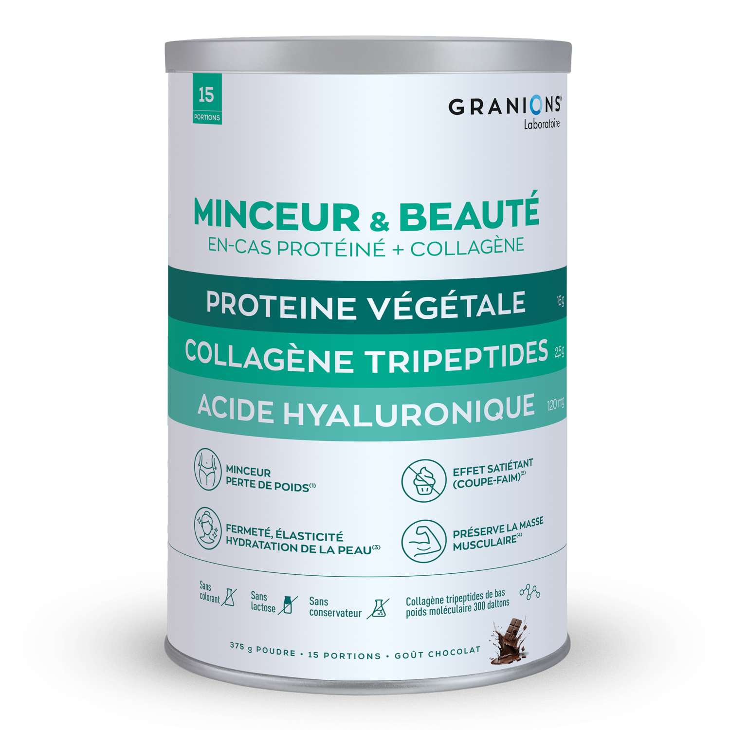 GRANIONS Protéine+ Minceur Beauté Protéine Végétale + Collagène + acide hyaluronique Préserve la masse musculaire avec les protéines Hydratation et élasticité avec les Tripeptides de collagène marin Goût Chocolat Complément alimentaire 275g MINCEUR & BEAUTÉ - L’EN-CAS PROTÉINÉ PERTE DE POIDS ET ALLIÉ DE VOTRE BEAUTÉ ! Découvrez la parfaite alliance entre minceur et beauté avec l’innovation Granions® Minceur & Beauté protéines végétales + tripeptides de collagène marin. Les protéines contribuent au développement et au maintien de la masse musculaire. Construction musculaire : 2 sources de protéines végétales : pois + riz. Cette formule est spécialement conçue et garantie sans lactose, offrant une meilleure digestibilité pour les personnes intolérantes au lactose. Perte de poids : En-cas satiétant : cette préparation aide à diminuer l’appétit grâce au Nopal. Minceur : cet en-cas protéiné vous aidera à brûler les graisses grâce au Cola. Le Nopal également présent dans la formule permet en plus d’absorber les graisses et le sucre Beauté de la peau :Les Tripeptides de collagène marin hydrolisé de très bas poids moléculaire (300 Daltons), sont hautement assimilables par l’organisme. Cette protéine est reconnue pour la fermeté, l’élasticité et l’hydratation de la peau. L’acide hyaluronique, naturellement présent dans le corps, est un actif reconnu pour l’élasticité et l’hydratation de la peau. Goût : Un délicieux goût chocolat pour une expérience gourmande sans compromis
