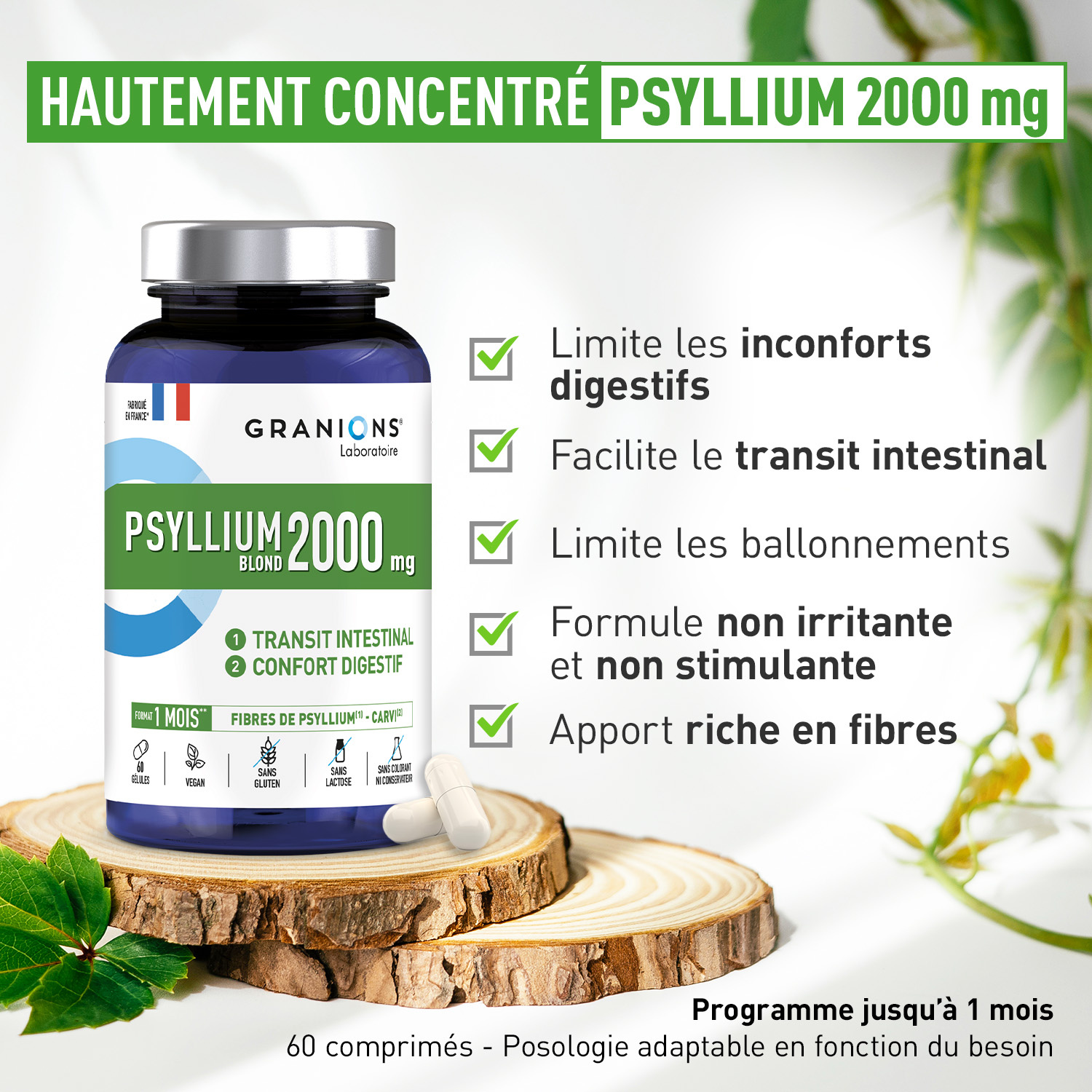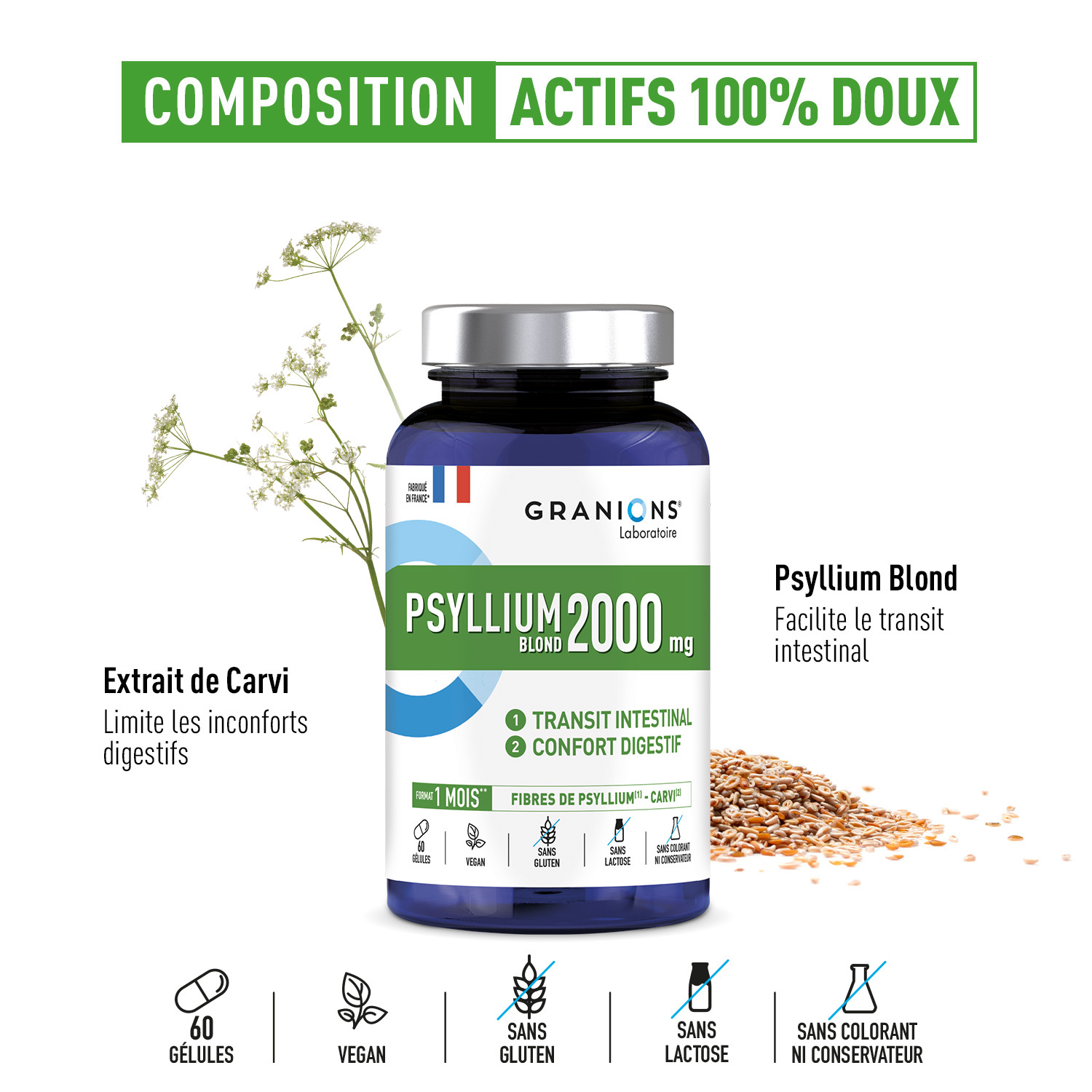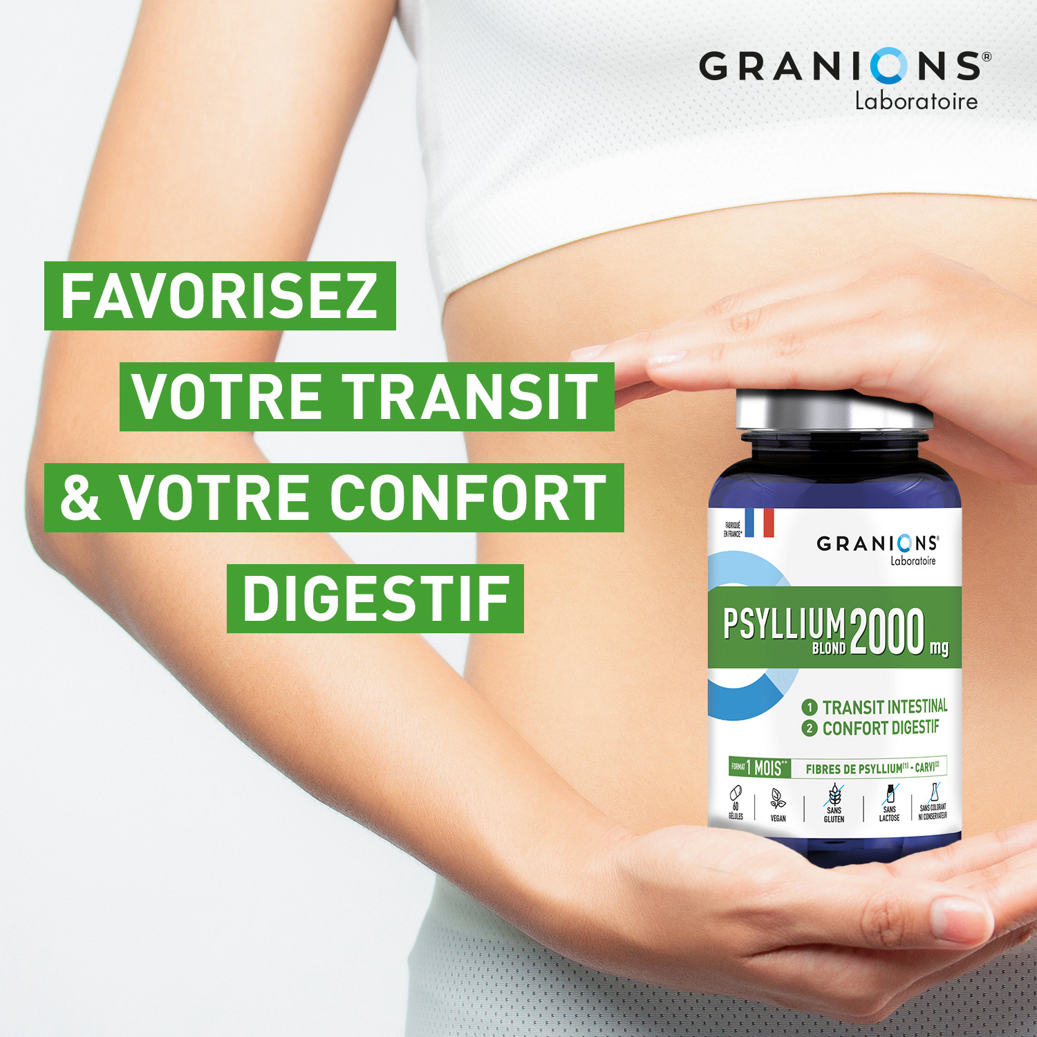 Le PSYLLIUM 1000 mg de Granions® est dédié au transit. Notre formule est hautement dosée en psyllium qui facilite le transit intestinal. La formule est également complétée par du carvi, actif reconnu pour aider à limiter les inconforts digestifs tels que les ballonnements, ainsi que du pruneau, de la mauve et du magnésium.