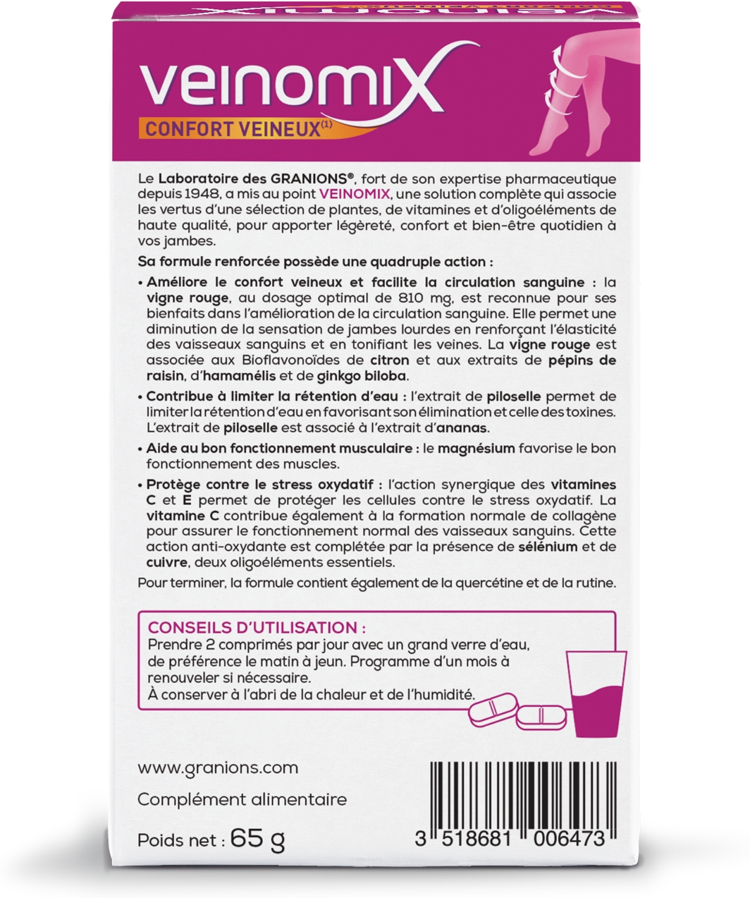 Le Laboratoire des GRANIONS®, fort de son expertise pharmaceutique depuis 1948, a mis au point VEINOMIX, une solution qui diffuse en continu les bienfaits d’une sélection rigoureuse de plantes, de vitamines et d’oligoéléments de haute qualité grâce à sa technologie de libération prolongée pendant 12h. Sa formule innovante possède une quadruple action : FAVORISE LES JAMBES LÉGÈRES: La Vigne rouge, dosé à 400 mg soit 1,6 g équivalent plante, contribue à réduire la sensation de jambes lourdes et fatiguées et favorise le retour veineux. La vitamine C contribue à la formation normale de collagène pour assurer le fonctionnement normal des vaisseaux sanguins. LIMITE LA RÉTENTION D’EAU : L’extrait de Piloselle facilite les fonctions d’élimination de l’organisme. PROTÈGE DU STRESS OXYDATIF : La vitamine E contribue à protéger les cellules contre le stress oxydatif. DÉTEND LES MUSCLES : Le Magnésium contribue à une fonction musculaire normale. La formule est renforcée en Ginkgo biloba et Hamamélis. L'action anti-oxydante est complétée par la présence de sélénium et de cuivre, deux oligoéléments essentiels.