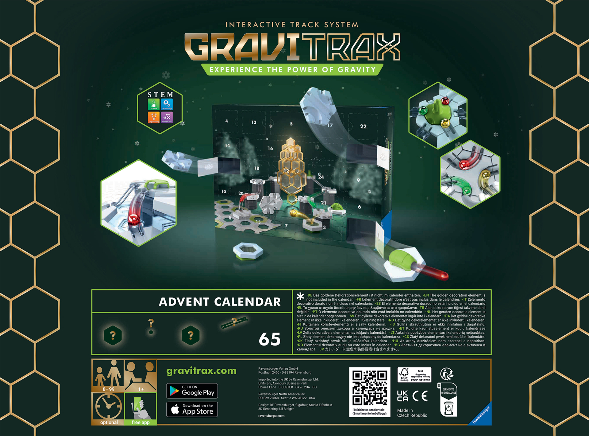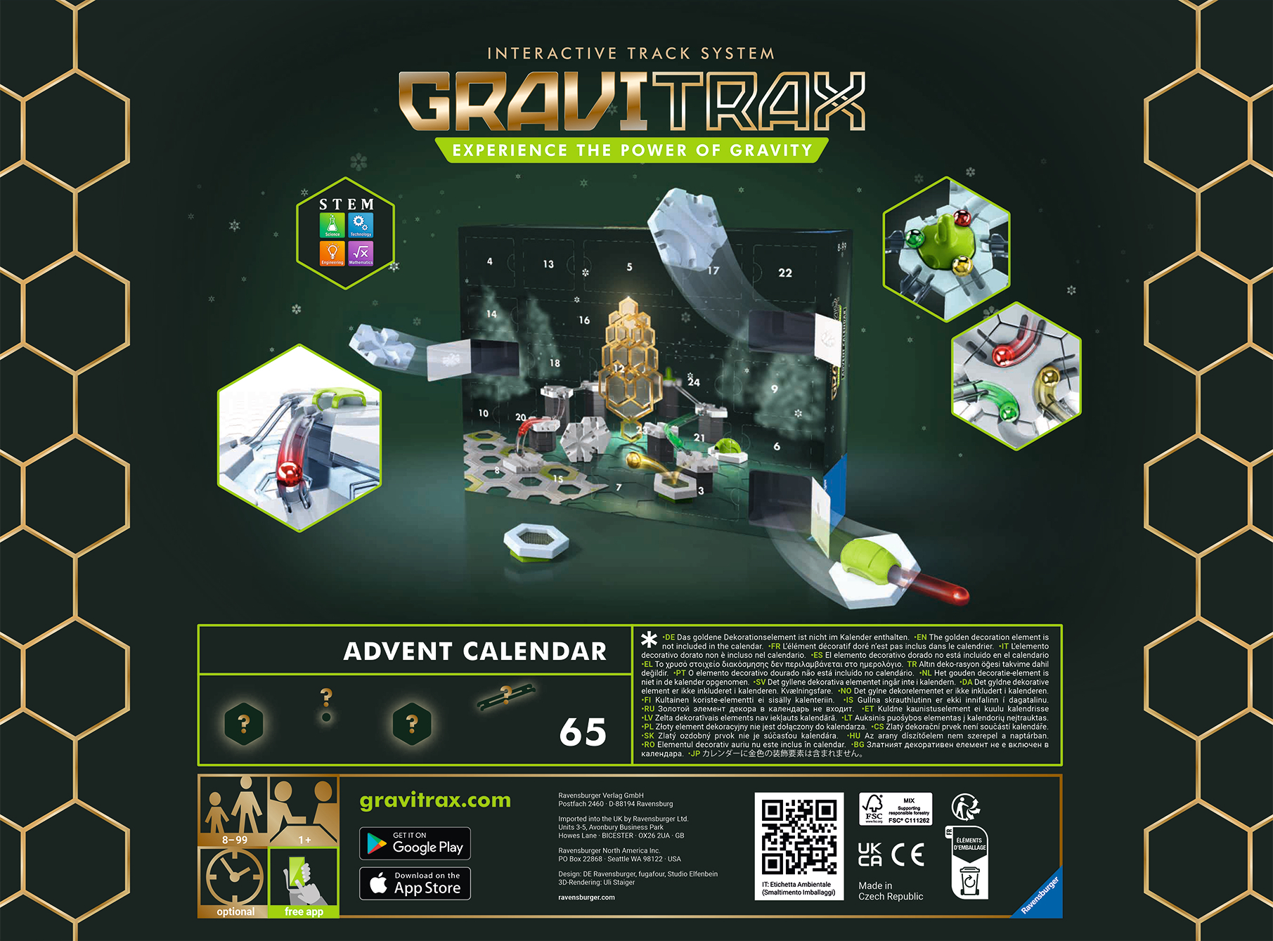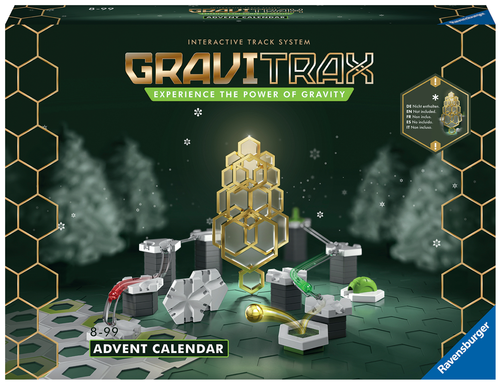 | Plus produit | 24 CASES SURPRISES : A l\'ouverture de chaque case de ce calendrier de l\'avent, les fans de GraviTrax auront le plaisir de découvrir des pièces de construction pour commencer ou compléter leur collection et booster leurs circuits de billes. Faites de décembre un mois magique avec le calendrier de l\'avent GraviTrax ! ELEMENTS INEDITS ET EXCLUSIFS : Ce calendrier rassemble plusieurs Eléments mais aussi des pièces de construction inédites comme une incroyable bille dorée, totalement exclusive ! C\'est le calendrier de l\'avent à ne pas manquer avec 65 pièces à découvrir. COMPATIBLE avec TOUS les produits GraviTrax de la gamme standard (blanche), PRO (noire) et POWER (grise). Il n\'est pas nécessaire de disposer d\'un starter set. UN CADEAU IDEAL pour les filles et les garçons dès 8 ans, et pour les fans de construction de tous les âges ! Fabriqués en Europe avec des matériaux de grande qualité, GraviTrax est fait pour durer et garantit des heures de jeu et d\'assemblage seul ou à plusieurs. Une idée cadeau parfaite pour un anniversaire ou pour Noël. JEU EDUCATIF STEM : GraviTrax est un système de construction très ludique qui permet aux enfants d\'expérimenter des lois physiques comme la gravité, le magnétisme ou la force cinétique. En manipulant les blocs et en testant leurs propres assemblages, ils développent à la fois leur créativité et leur compréhension de ces principes scientifiques. |