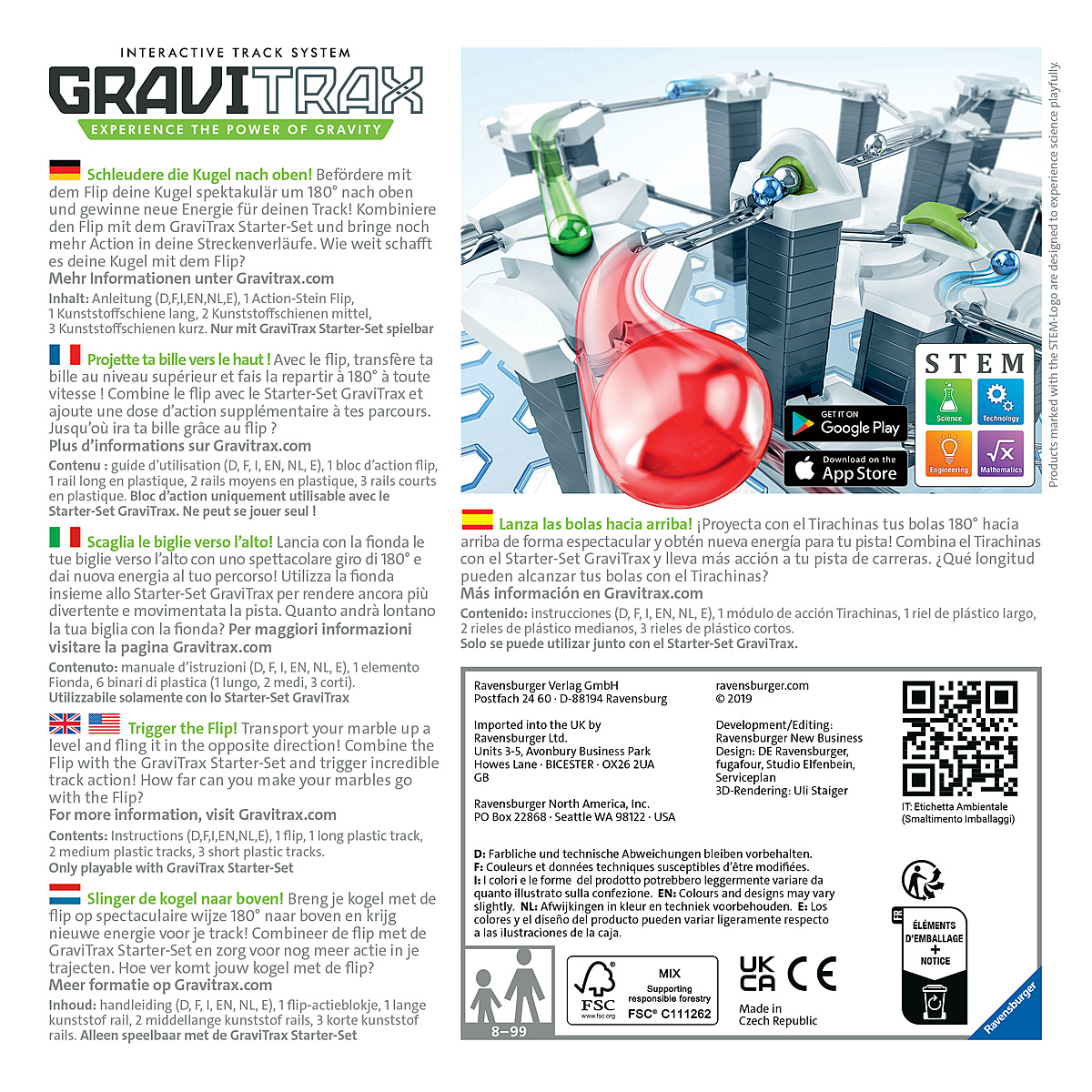 | Plus produit | FLIP : Un élément innovant pour booster ses circuits de billes GraviTrax ! Le Flip se déclenche mécaniquement à l\'arrivée d\'une bille, qu\'il projette à l\'étage supérieur et fait repartir dans le sens inverse. Un moyen ludique et spectaculaire de jouer avec les différences de hauteur ! MODULABLE A L\'INFINI et COMPATIBLE avec tous les produits GraviTrax. Cet élément se joue avec au moins un Starter Set (indispensable pour démarrer) puis se combine avec toutes les gammes GraviTrax. Découvrez un large choix de sets d\'extension et d\'éléments pour enrichir vos circuits et imaginer un nombre illimité de parcours différents. CONTENU : 1 bloc d\'action Flip, 1 rail long, 2 rails moyens, 3 rails courts, 1 guide d\'utilisation illustré et en français UN CADEAU IDEAL pour les filles et les garçons à partir de 8 ans, et pour les fans de construction de tous âges ! Fabriqués en Europe avec des matériaux de grande qualité, GraviTrax est fait pour durer et garantit des heures de jeu et d\'assemblage, seul ou à plusieurs. Une idée cadeau parfaite pour un anniversaire ou pour Noël. JEU EDUCATIF STEM : GraviTrax est un système de construction très ludique qui permet aux enfants d\'expérimenter des lois physiques comme la gravité, le magnétisme ou la force cinétique. En manipulant les blocs et en testant leurs propres assemblages, ils développent à la fois leur créativité et leur compréhension de ces principes scientifiques. |