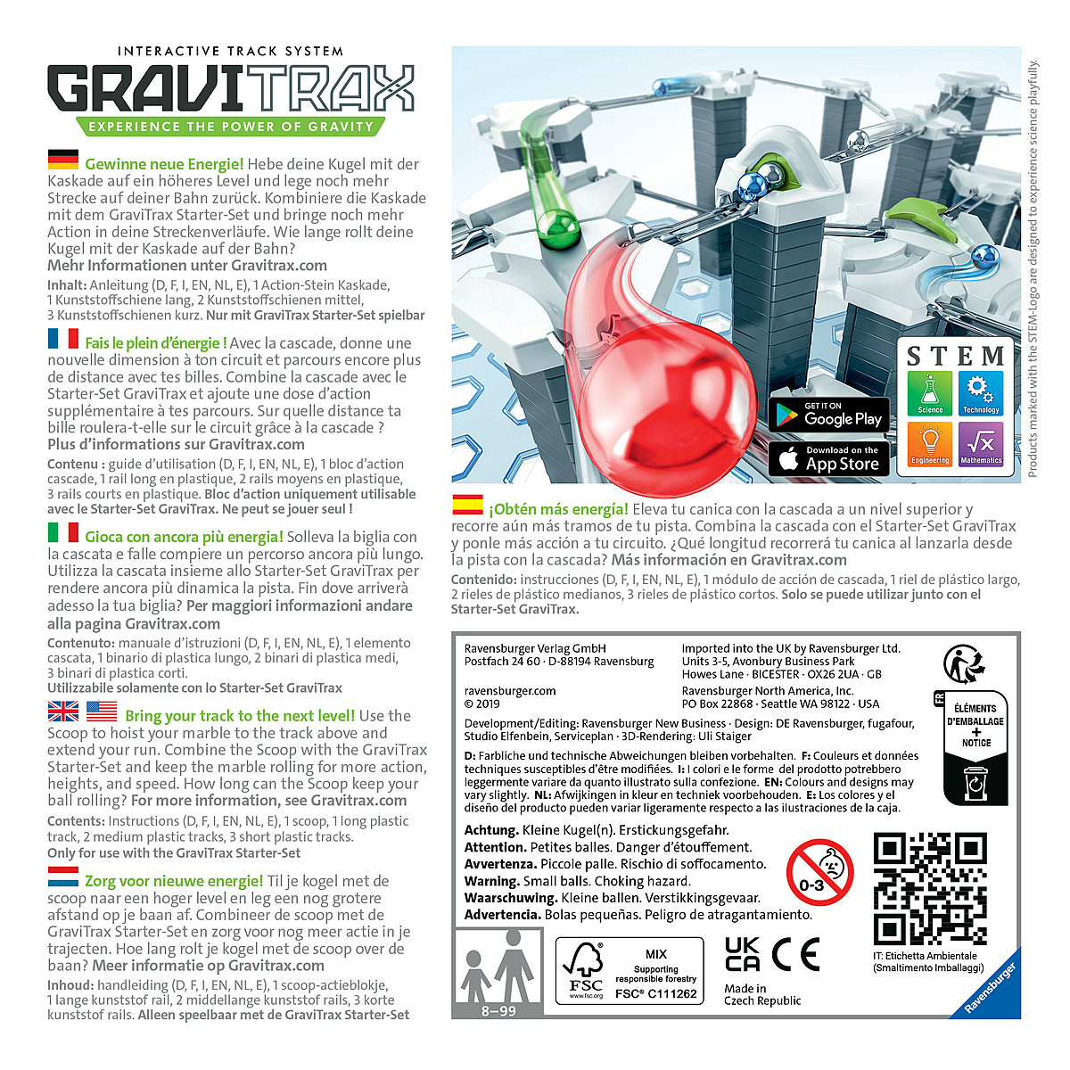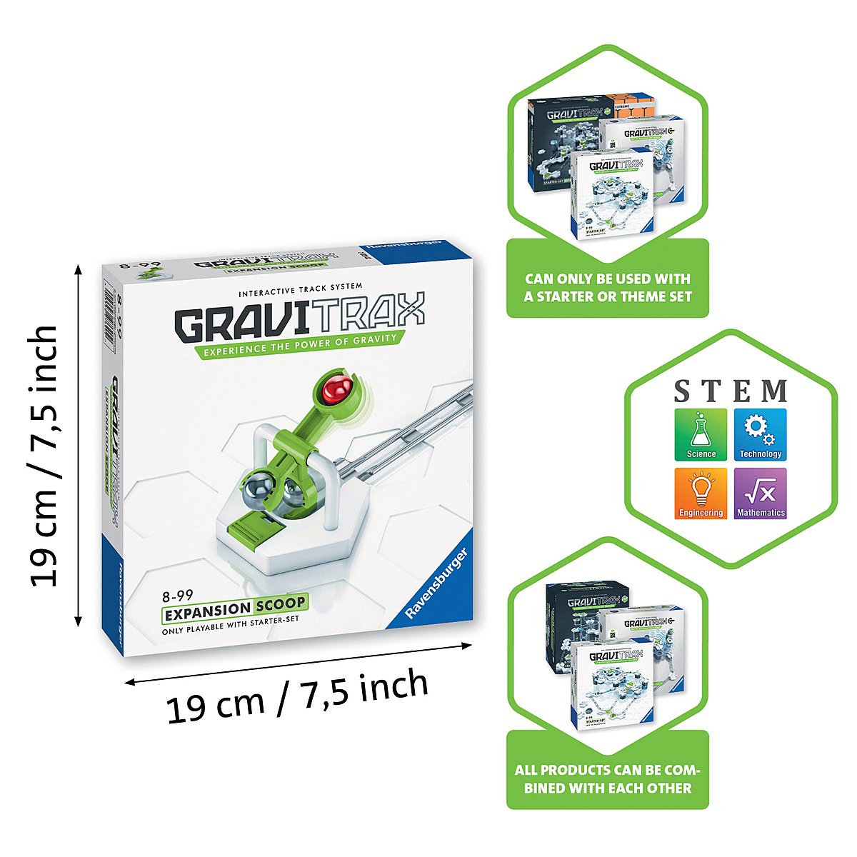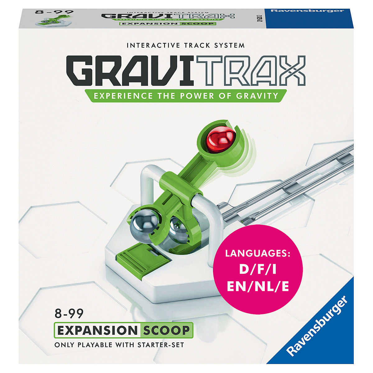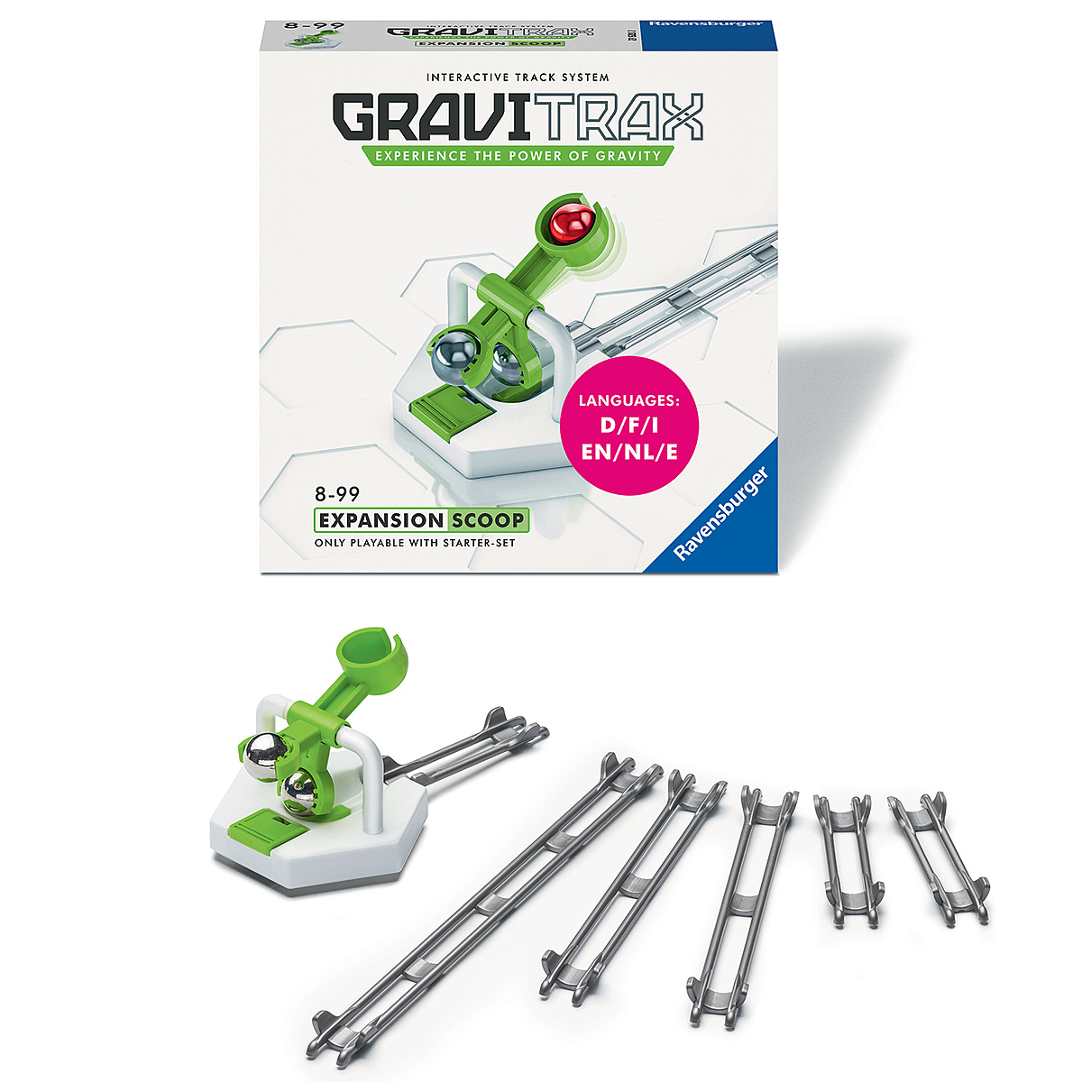 | Plus produit | SCOOP : Un élément pour booster ses circuits de billes GraviTrax ! Le Scoop se déclenche mécaniquement à l\'arrivée d\'une bille, pivote sur son axe et envoie la bille au niveau supérieur. Grâce à ce système à bascule innovant, les billes peuvent franchir des différences de hauteur facilement avant de poursuivre leur course. MODULABLE A L\'INFINI et COMPATIBLE avec tous les produits GraviTrax. Cet élément se joue avec au moins un Starter Set (indispensable pour démarrer) puis se combine avec toutes les gammes GraviTrax. Découvrez un large choix de sets d\'extension et d\'éléments pour enrichir vos circuits et imaginer un nombre illimité de parcours différents. CONTENU : 1 élément Scoop, 1 rail long, 2 rails moyens, 3 rails courts, 1 guide d\'utilisation illustré et en français UN CADEAU IDEAL pour les filles et les garçons à partir de 8 ans, et pour les fans de construction de tous âges ! Fabriqués en Europe avec des matériaux de grande qualité, GraviTrax est fait pour durer et garantit des heures de jeu et d\'assemblage, seul ou à plusieurs. Une idée cadeau parfaite pour un anniversaire ou pour Noël. JEU EDUCATIF STEM : GraviTrax est un système de construction très ludique qui permet aux enfants d\'expérimenter des lois physiques comme la gravité, le magnétisme ou la force cinétique. En manipulant les blocs et en testant leurs propres assemblages, ils développent à la fois leur créativité et leur compréhension de ces principes scientifiques. |