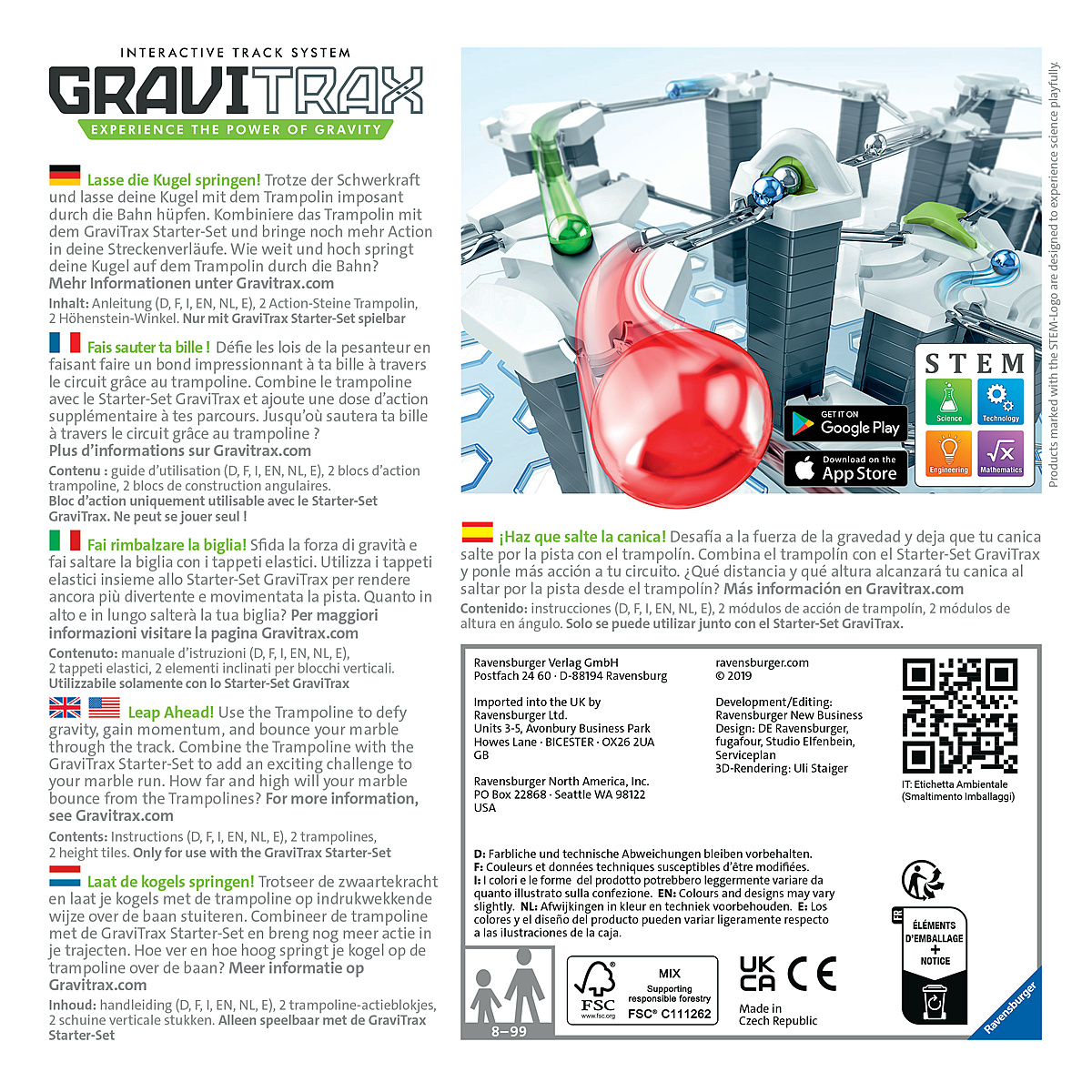 | Plus produit | TRAMPOLINE : Un élément pour booster ses circuits de billes GraviTrax et faire rebondir les billes d\'un trampoline à l\'autre ! Plusieurs degrés d\'inclinaison possibles, pour créer des parcours encore plus personnalisés. Après le dernier trampoline, la bille peut atterrir sur un bloc classique ou sur un rail et ainsi poursuivre sa course. MODULABLE A L\'INFINI et COMPATIBLE avec tous les produits GraviTrax. Cet élément se joue avec au moins un Starter Set (indispensable pour démarrer) puis se combine avec toutes les gammes GraviTrax. Découvrez un large choix de sets d\'extension et d\'éléments pour enrichir vos circuits et imaginer un nombre illimité de parcours différents. CONTENU : 2 trampolines, 2 blocs de construction inclinés, 1 guide d\'utilisation illustré et en français UN CADEAU IDEAL pour les filles et les garçons à partir de 8 ans, et pour les fans de construction de tous âges ! Fabriqués en Europe avec des matériaux de grande qualité, GraviTrax est fait pour durer et garantit des heures de jeu et d\'assemblage, seul ou à plusieurs. Une idée cadeau parfaite pour un anniversaire ou pour Noël. JEU EDUCATIF STEM : GraviTrax est un système de construction très ludique qui permet aux enfants d\'expérimenter des lois physiques comme la gravité, le magnétisme ou la force cinétique. En manipulant les blocs et en testant leurs propres assemblages, ils développent à la fois leur créativité et leur compréhension de ces principes scientifiques. |