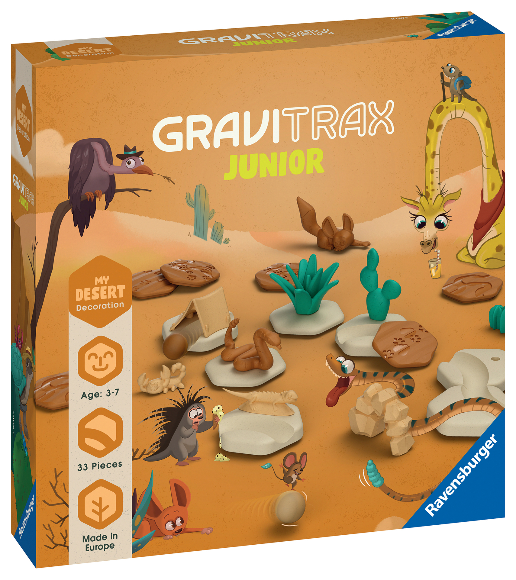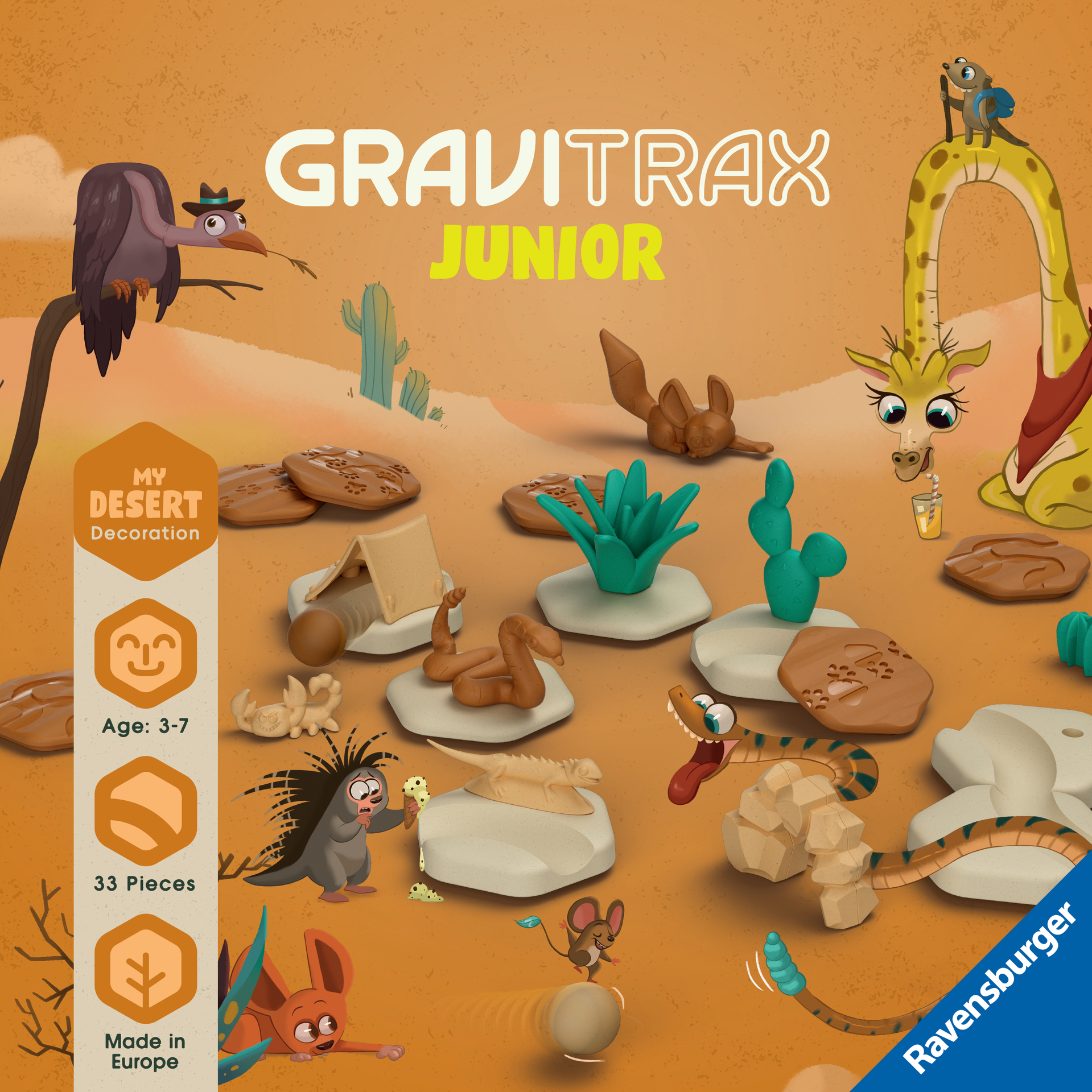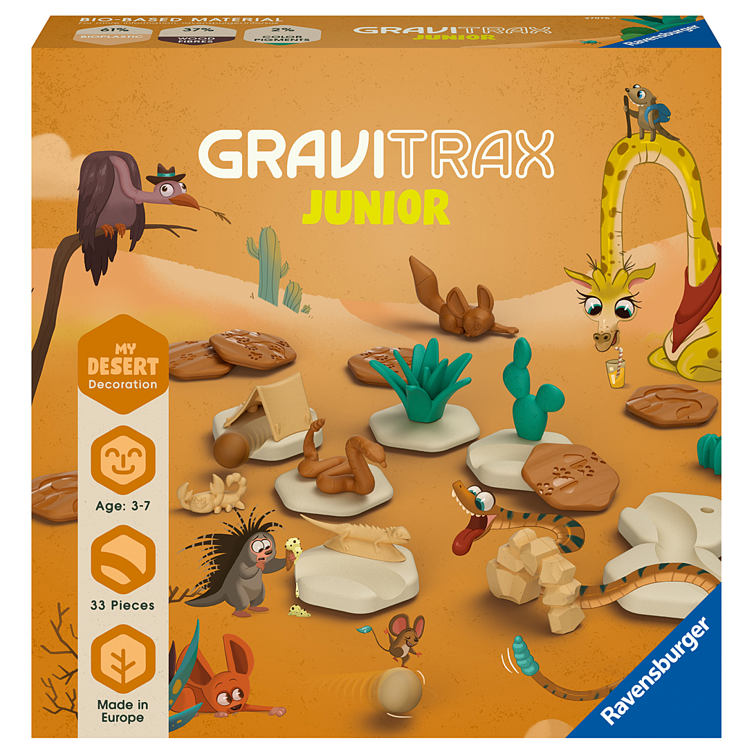| Plus produit | GRAVITRAX JUNIOR POUR 3 ANS : INITIATION A LA CONSTRUCTION GRAVITRAX grâce à un coffret complet de 28 pièces pour bénéficier de décorations supplémentaires sur le thème du desert. Avec JUNIOR, les tout-petits s\'amusent à combiner des blocs pour créer des circuits amusants et colorés. Nécessite au moins un Starter Set GraviTrax JUNIOR. MODULABLE A L\'INFINI et COMPATIBLE avec tous les produits GraviTrax JUNIOR. Avec ce Set d\'extension décoration, les tout-petits peuvent immédiatement commencer à jouer et à construire des circuits. Découvrez une large gamme JUNIOR de starter sets et déléments, tous combinables entre eux, pour booster les circuits. CONTENU 28 PIECES : 8 blocs grandes courbes, 9 éléments de décoration 3D, 2 animaux en carton, 3 blocs base ouverte, 6 bases de décoration et 1 guide d\'utilisation. Une IDEE CADEAU parfaite pour un anniversaire ou pour Noël. CONÇU POUR 3 ANS Les pièces sont pensées pour les tout-petits avec un contenu facile à prendre en main. Les matériaux sont DURABLES, fabriqués en Europe et issus à 98% de MATIERES BIOSOURCES : bois et plastique bio. Etant conscients de la manipulation des tout-petits, les pièces sont fabriquées de manière à durer et à garantir des heures de jeu. JEU EDUCATIF STEM : GraviTrax JUNIOR favorise l\'apprentissage de l\'enfant en stimulant sa réflexion lors de la conception des circuits de billes ainsi que ses capacités motrices et ses relations de cause à effet lors du jeu. Les éléments décoratifs jungle inclus stimulent également la création et l\'imagination des enfants. |