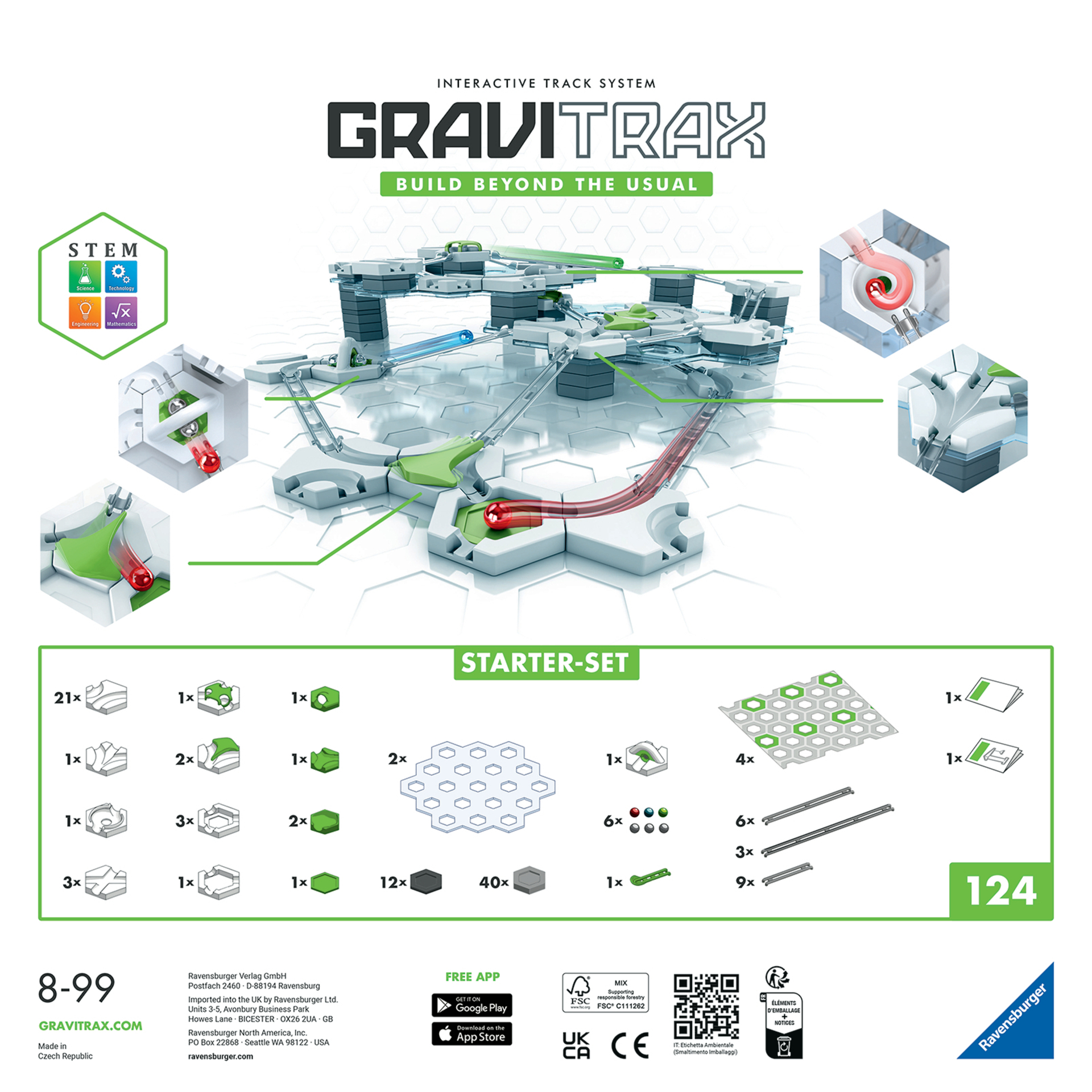 | Plus produit | UN COFFRET COMPLET avec tous les éléments nécessaires pour construire des circuits de billes GraviTrax spectaculaires. Avec GraviTrax les enfants s\'amusent à combiner des blocs et des rails pour créer des parcours incroyables. Ils peuvent suivre des modèles d\'assemblage ou inventer leurs propres circuits. Les possibilités sont infinies ! MODULABLE A L\'INFINI et COMPATIBLE avec tous les produits GraviTrax. Avec ce Starter Set, les enfants peuvent immédiatement commencer à jouer et à construire des circuits. Découvrez une large gamme de sets d\'extension et d\'éléments, tous combinables entre eux, pour booster vos circuits et créer un nombre illimité de parcours différents. CONTENU : 4 plaques, 2 plateformes transparentes, 6 billes, 40 blocs de construction épais, 12 blocs de construction fins, 1 bloc 3-en-1, 1 bloc départ, 21 virages, 3 intersections, 2 aiguillages, 1 tourbillon, 1 canon magnétique, 18 rails, 1 échelle d\'arrivée, 4 blocs avec inserts, 1 guide illustré et en français, 1 carnet de plans de montage UN CADEAU IDEAL pour les filles et les garçons à partir de 8 ans, et pour les fans de construction de tous âges ! Fabriqués en Europe avec des matériaux de grande qualité, GraviTrax est fait pour durer et garantit des heures de jeu et d\'assemblage, seul ou à plusieurs. Une idée cadeau parfaite pour un anniversaire ou pour Noël. JEU EDUCATIF STEM : GraviTrax est un système de construction très ludique qui permet aux enfants d\'expérimenter des lois physiques comme la gravité, le magnétisme ou la force cinétique. En manipulant les blocs et en testant leurs propres assemblages, ils développent à la fois leur créativité et leur compréhension de ces principes scientifiques. |