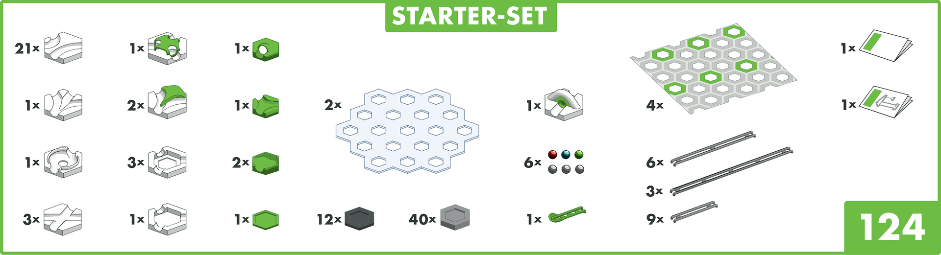 | La boîte contient | 4 plaques en carton, 2 plateformes transparentes, 6 billes, 40 blocs de construction épais, 12 blocs de construction fins, 1 bloc 3-en-1, 1 bloc départ, 21 virages, 3 intersections, 2 aiguillages, 1 tourbillon, 1 canon magnétique, 3 rails longs, 6 rails moyens, 9 rails courts, 1 marqueur d'arrivée, 4 blocs base avec inserts : 2 attrapeurs, 1 chute libre, 1 splash, 1 arrivée, 1 guide d'utilisation, 1 carnet d'exercices |