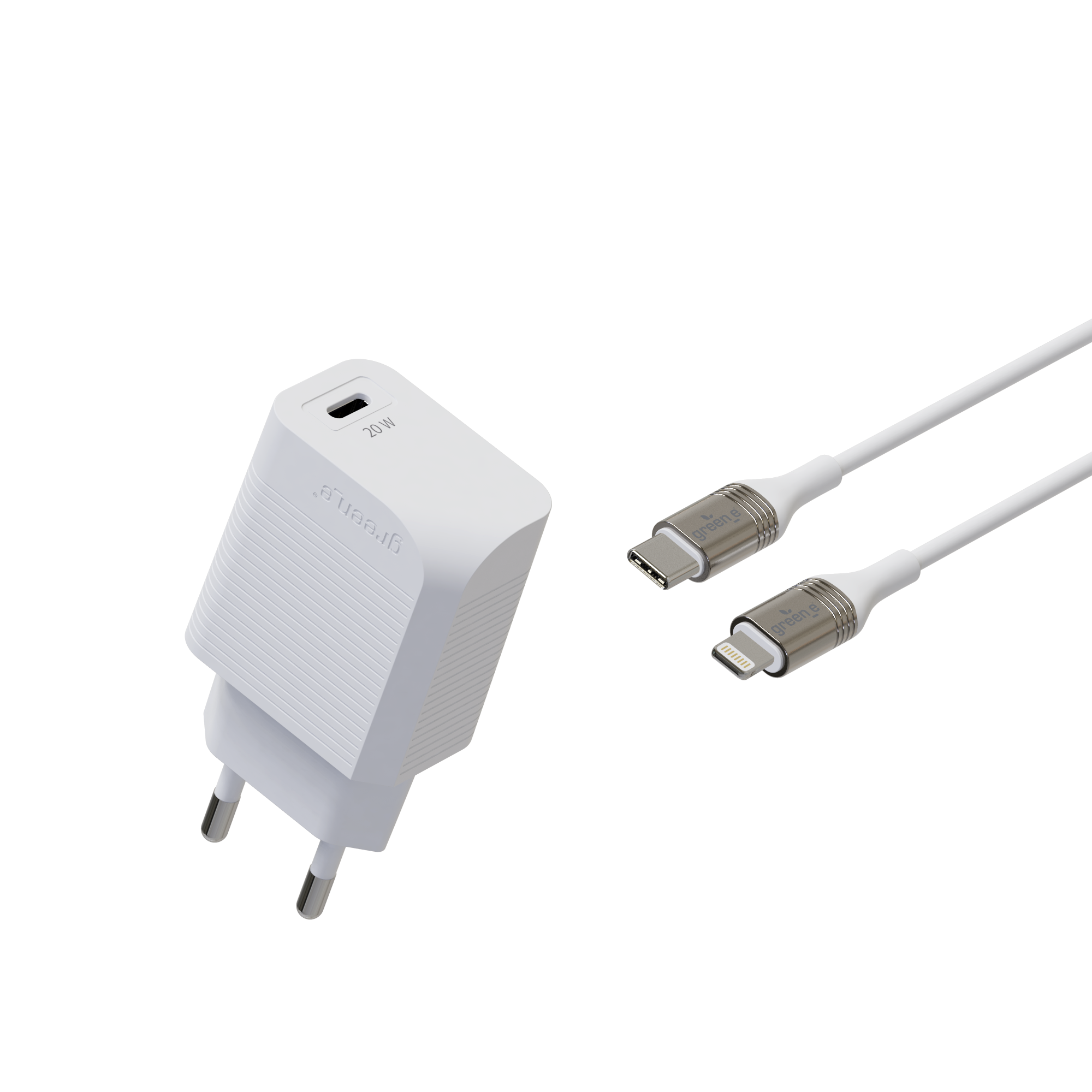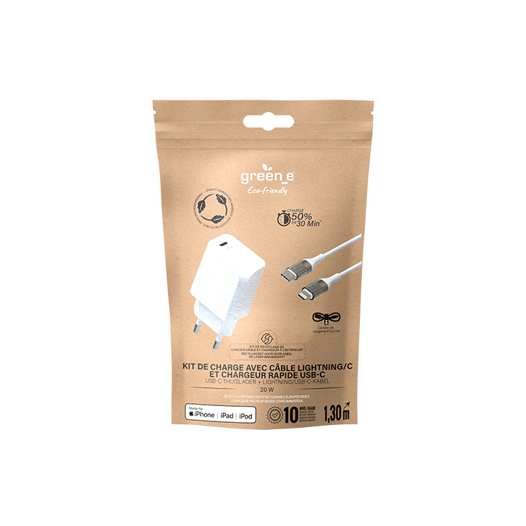 Kit de charge rapide éco-conçu pour la maison avec chargeur 1 USB-C 20W et câble Lightning vers USB-C 1,30 m