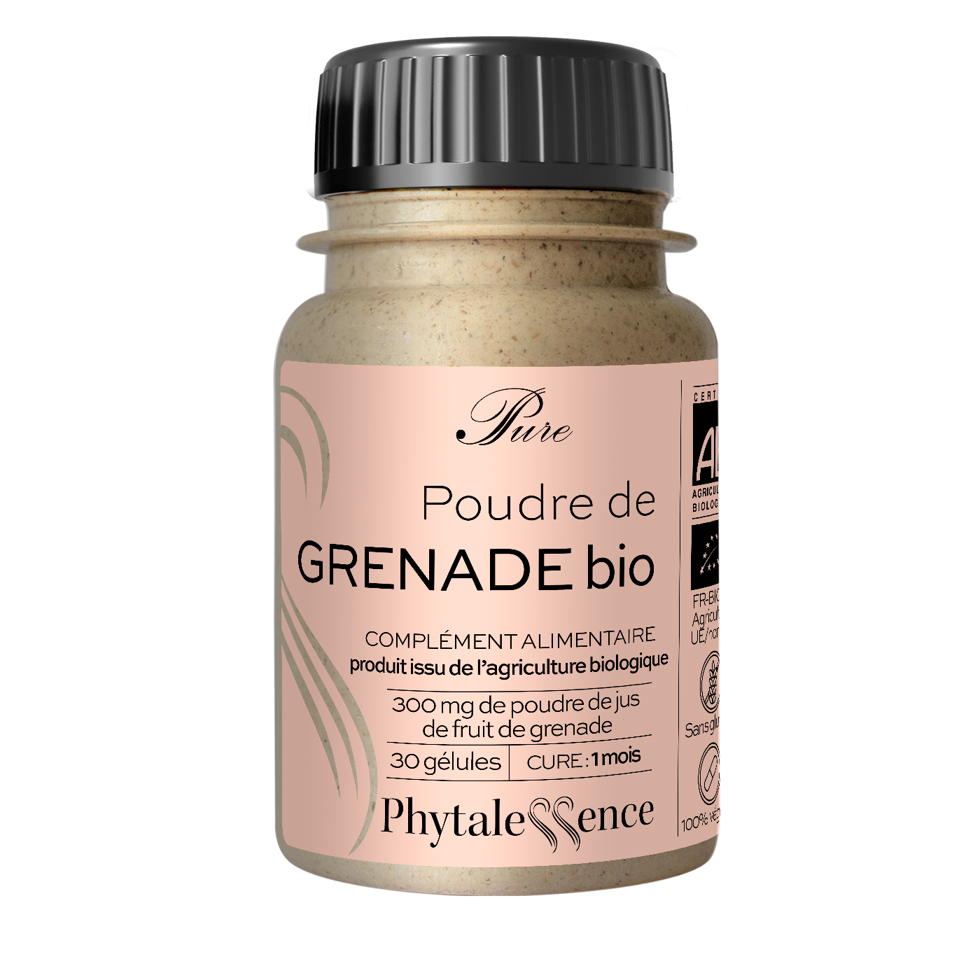 Ingrédients : Poudre de jus de fruit de grenade (punica granatum), agent anti agglomérant : poudre d’acacia gélule végétale (hypromellose)