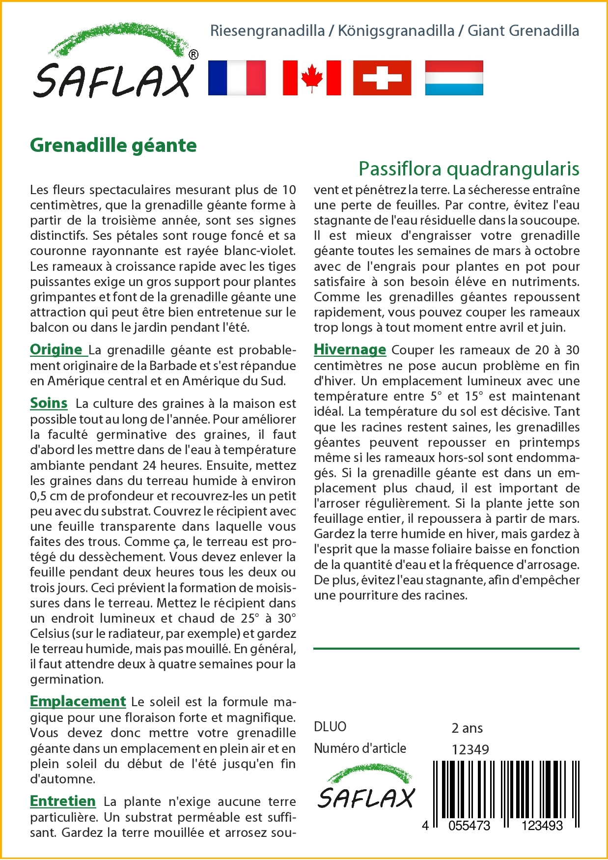 | Libellé | Grenadille géante - 12 graines - Avec substrat de culture aseptique - Passiflora quadrangularis |