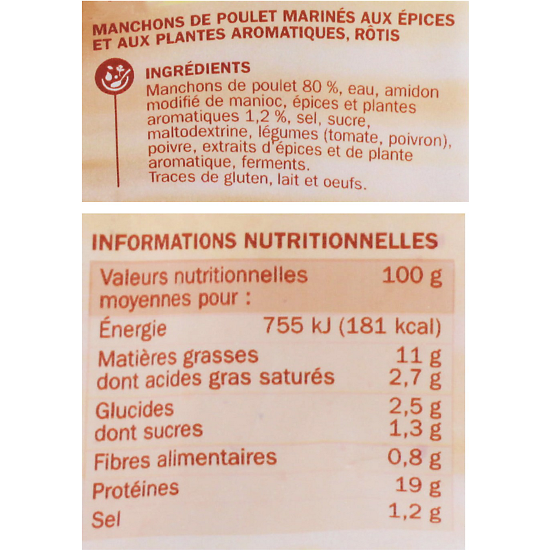 Ingrédients : Manchons de poulet 80 %, eau, amidon modifié de manioc, épices et plantes aromatiques 1,2 %, sel, sucre, maltodextrine, légumes (tomate, poivron), poivre, extraits d'épices et de plante aromatique, ferments.