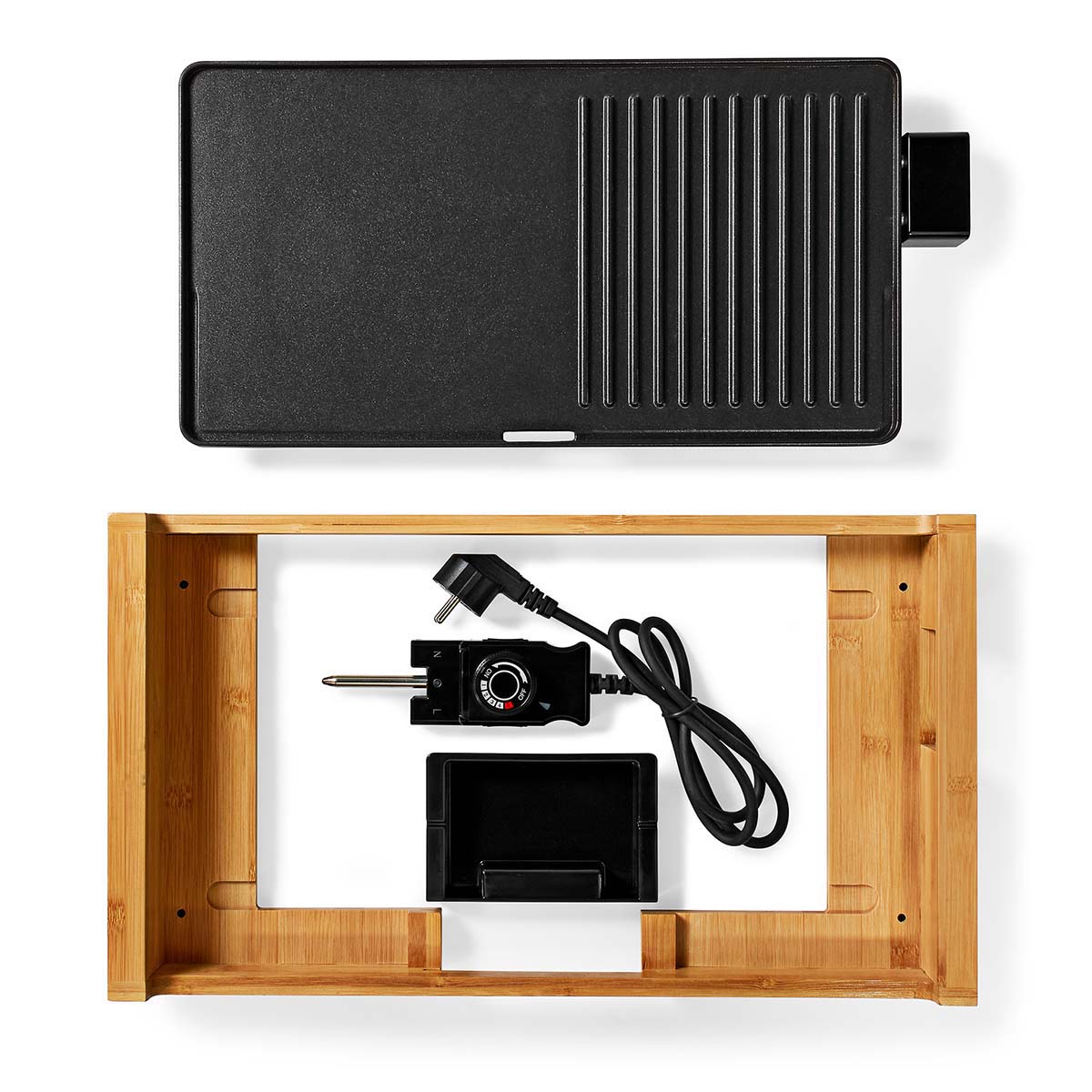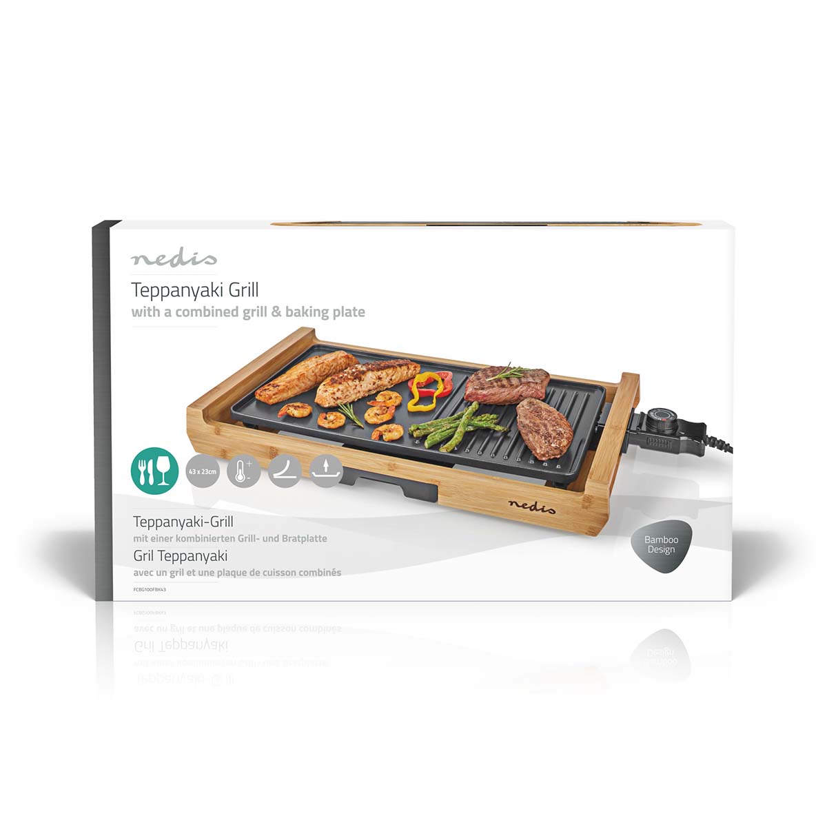 fcbg100fbk43 - gril de table - 6 personnes - 4 réglages de chaleur - Élégant et tendance, ce gril est doté d'un coffret en bambou résistant et arbore un look moderne et naturel. Il combine une plaque de cuisson et un grill pour la cuisson et les grillades. Le gril est parfait pour préparer de la viande, du poisson, des légumes, et bien plus encore. La surface de cuisson de 43 x 23 cm permet des dîners simples et délicieux pour un maximum de 6 personnes.Le puissant gril de 1800 W est doté d'un thermostat réglable qui garantit une préparation parfaite des aliments. Le gril est facile à nettoyer car tous les jus et graisses sont évacués et le revêtement antiadhésif empêche les résidus alimentaires. Videz le bac de récupération et mettez le au lave-vaisselle avec la plaque teppanyaki. Si vous souhaitez protéger davantage votre plaque, vous pouvez simplement l'essuyer avec une serviette humide. Elle est dotée de pieds antidérapants pour garantir une cuisson sûre et stable.