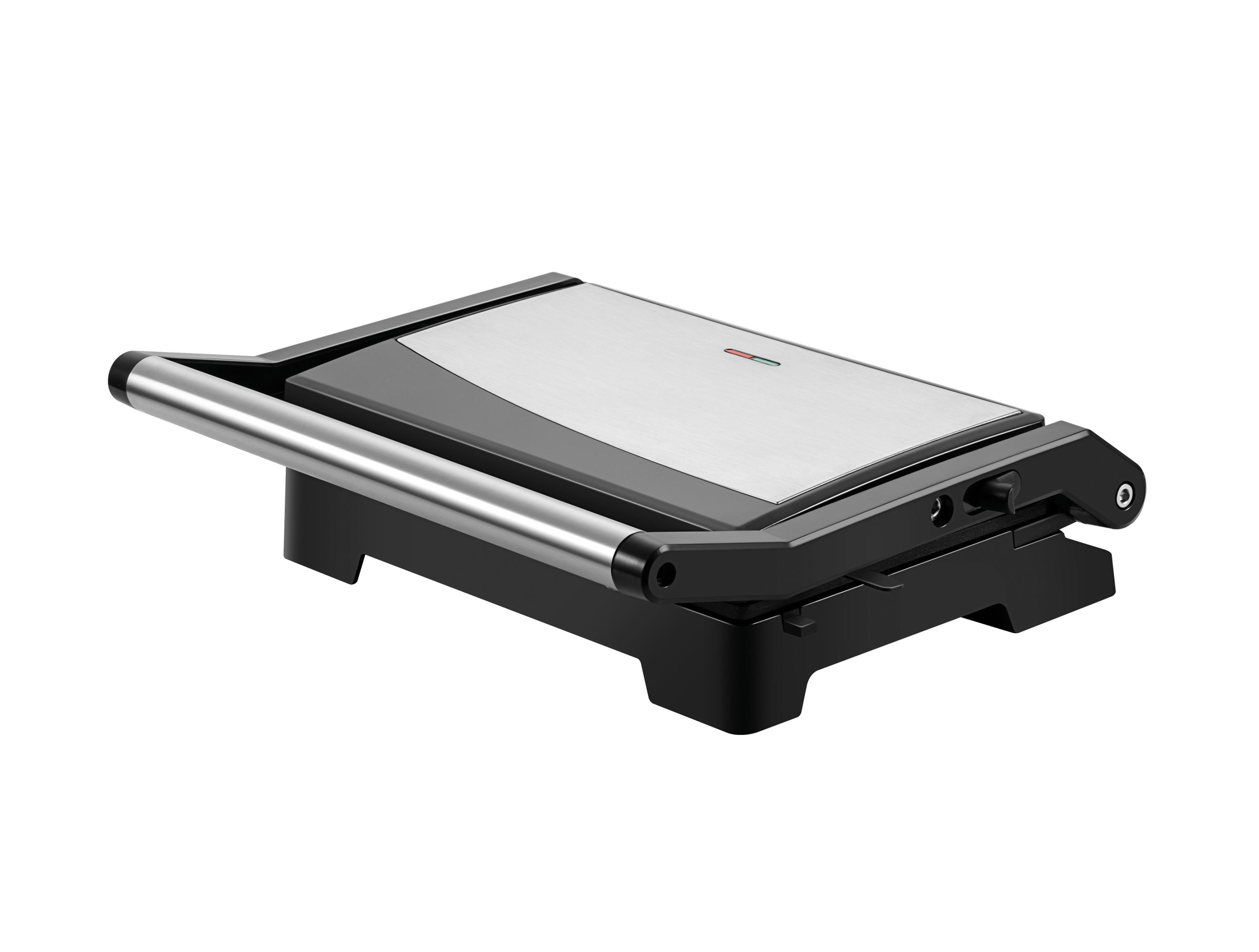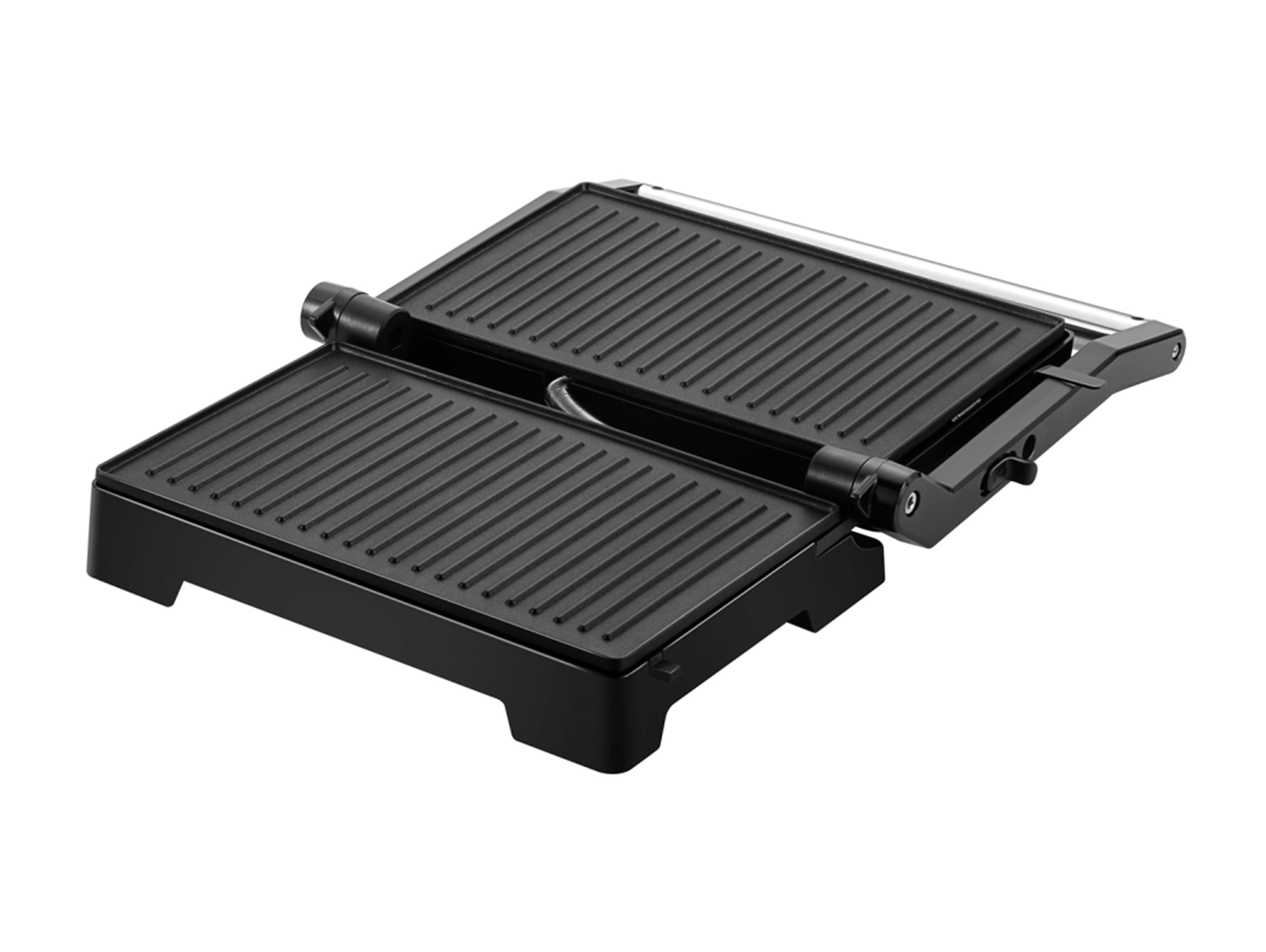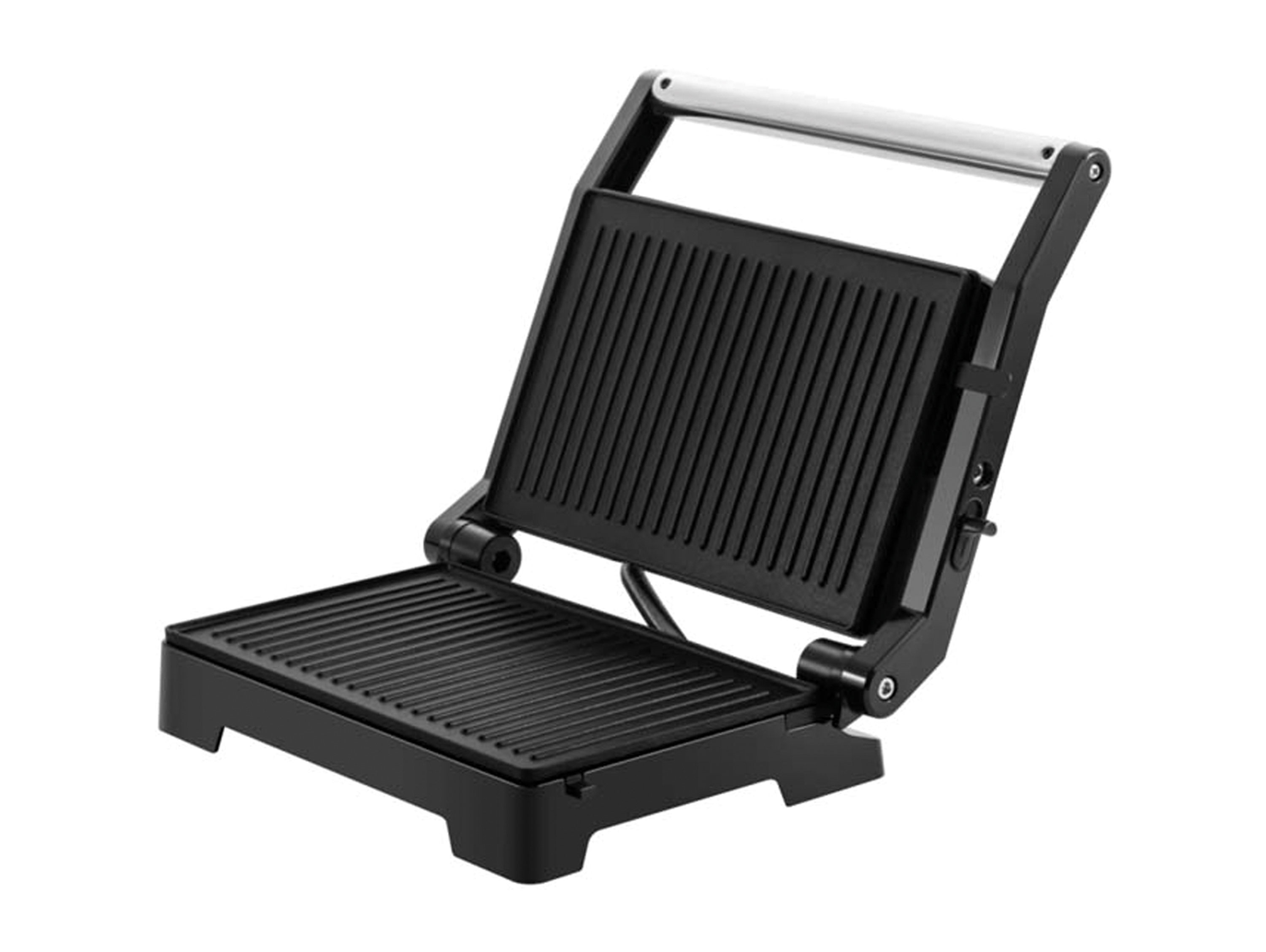 | Autre(s) information(s) | Gril électrique compact avec plaques anti-adhésives et 900W de puissance. Design classique en acier. Très facile à nettoyer. |