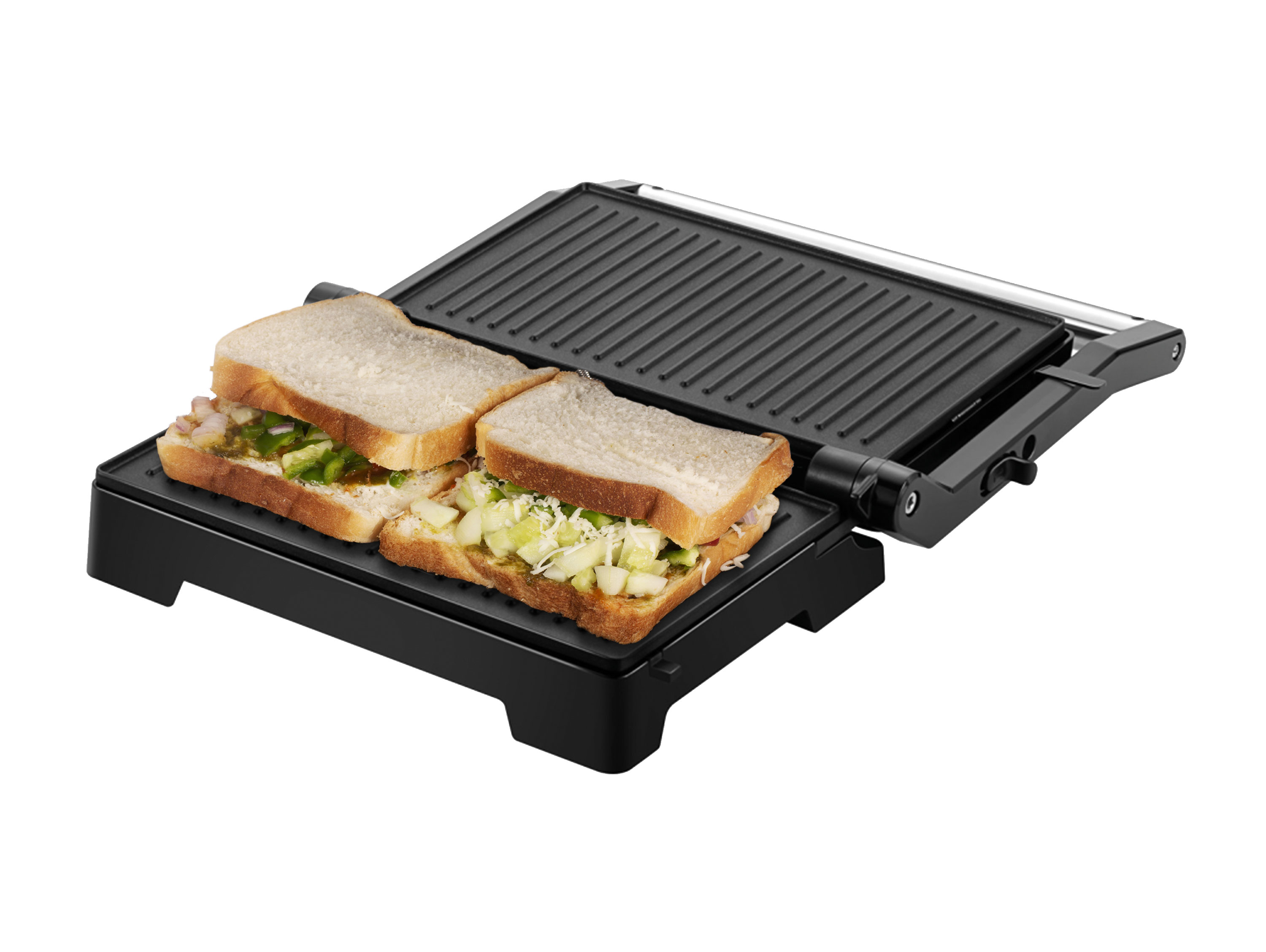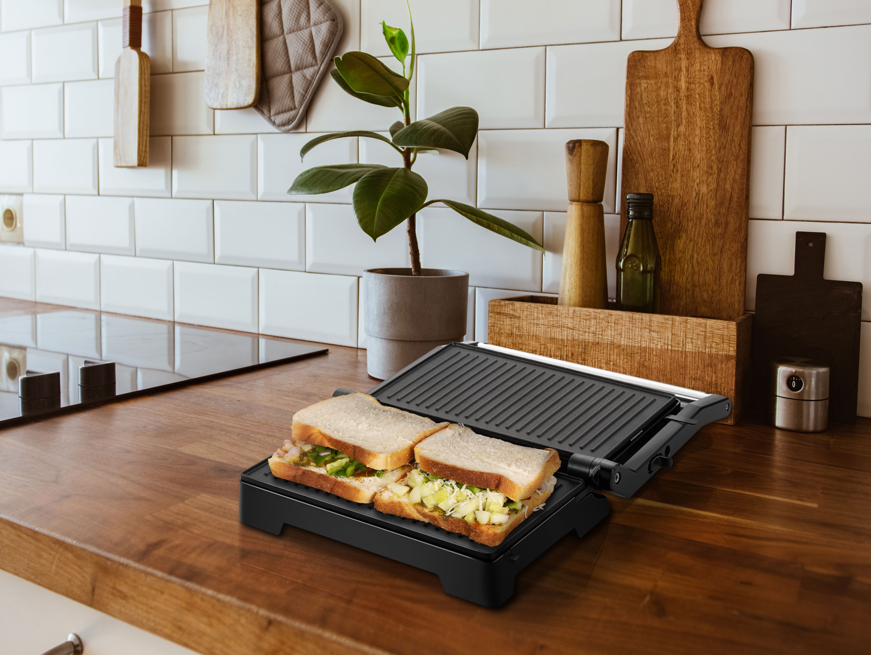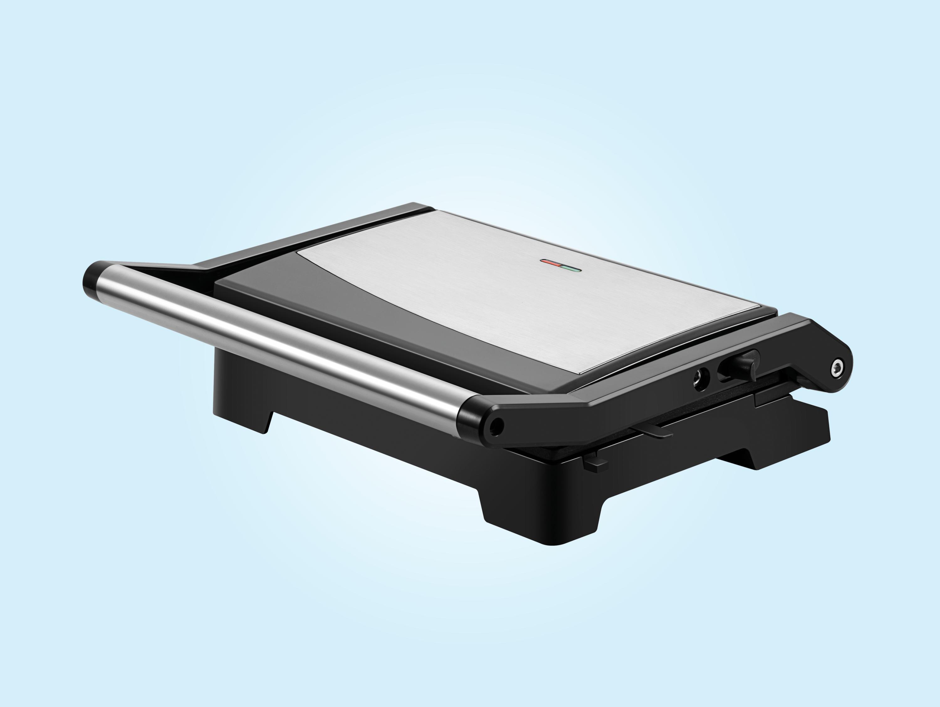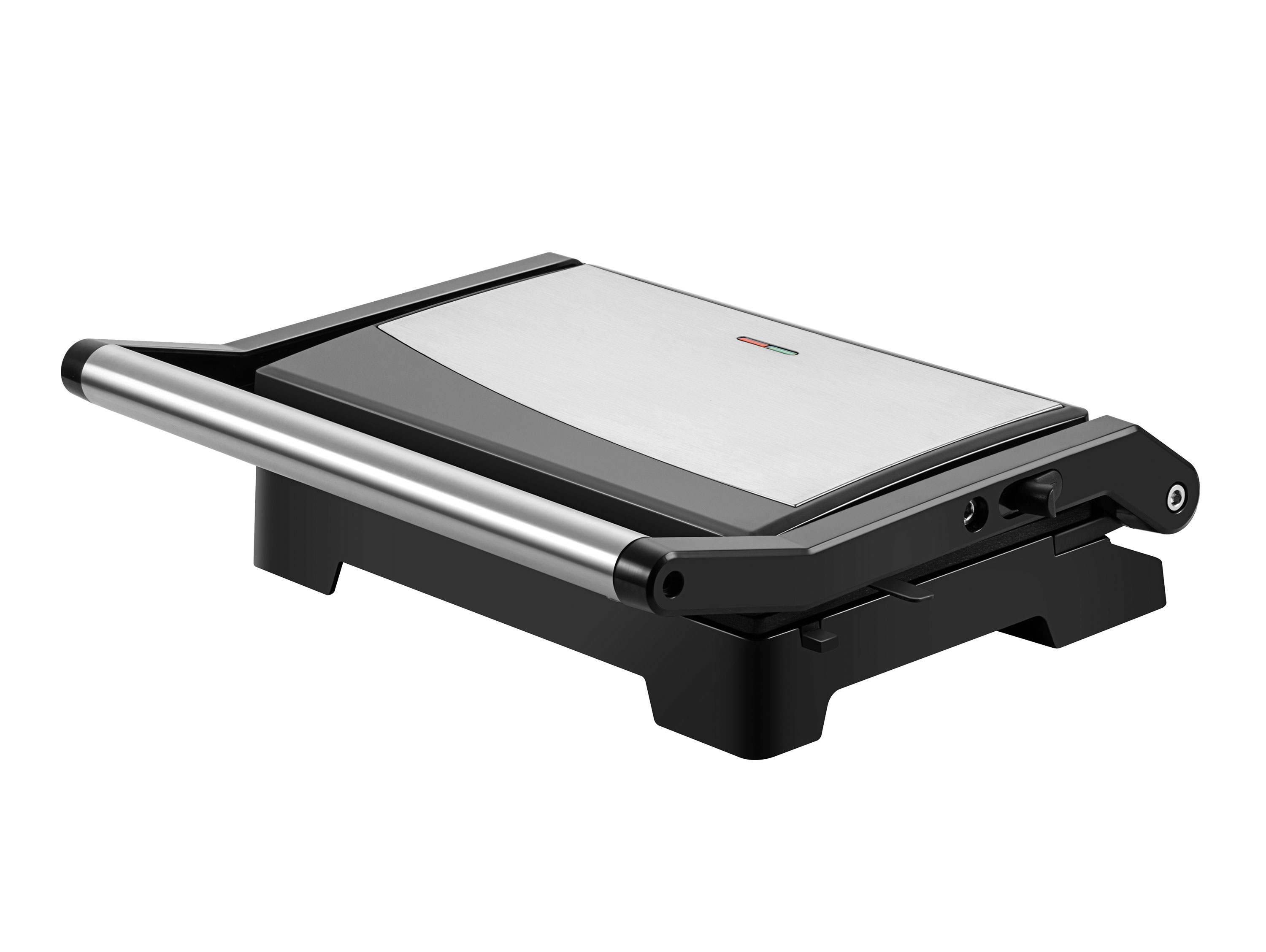 | Autre(s) information(s) | Gril électrique compact avec plaques anti-adhésives et 900W de puissance. Design classique en acier. Très facile à nettoyer. |