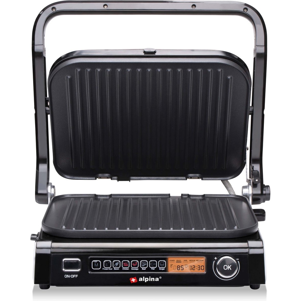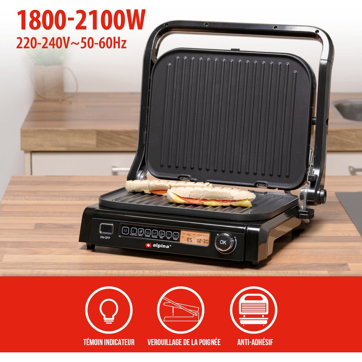 | Libellé | Grill électrique Multi fonction Panini Viande 2100W Minuterie 8 réglages Cuisson intelligente Plaque Anti-adhésive ALPINA |
