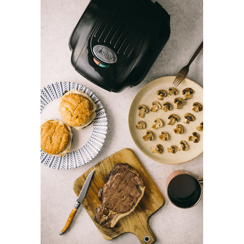 - FACILE A UTILISER : le Grill Electrique Gotham Steel™ peut fonctionner comme presse à panini, machine à sandwich, griller de la viande. Le Grill Electrique Gotham Steel™ dispose d'une poignée qui permet d'ouvrir et de fermer le couvercle en toute sécurité. Il est compact, facile à ranger dans un placard.