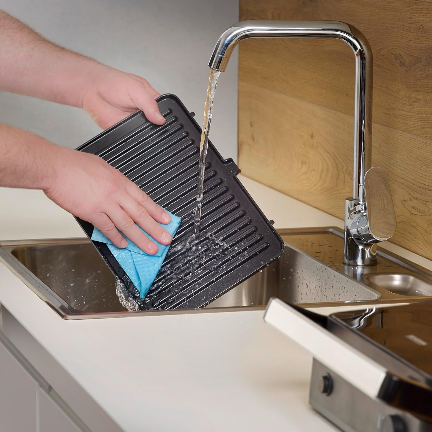 Parfait pour griller la viande, le poisson, les légumes, les sandwichs, paninis, pain, baguette, et gratiner le fromage Gril viande, 1800 W, noir/inox, env. 220°C, large surface de cuisson avec revêtement céramique antiadhésif (30 x 22 cm) S'ouvre totalement pour une surface de cuisson deux fois plus grande, plaques de cuisson amovibles