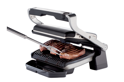 Optigrill + détecte, à l'aide de capteurs, le nombre et la taille des morceaux en cuisson ainsi que leur épaisseur afin d'ajuster automatiquement la température et le temps de cuisson. Un voyant lumineux permet de contrôler directement la progression de la cuisson par exemple pour la viande rouge: bleu, puis vert au début de la cuisson, jaune lorsque les morceaux sont saignants, orange lorsqu'ils sont à point et enfin rouge si vous les aimez bien cuits.