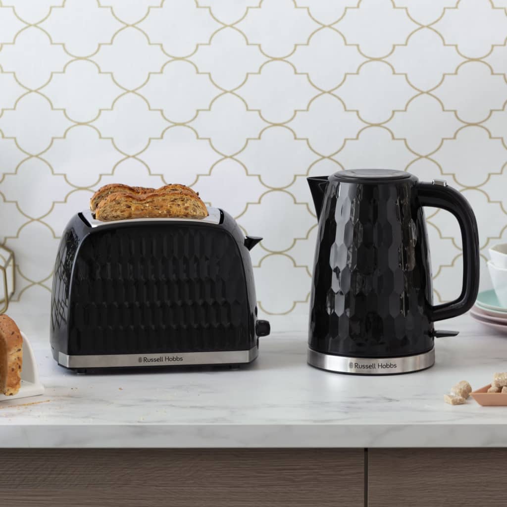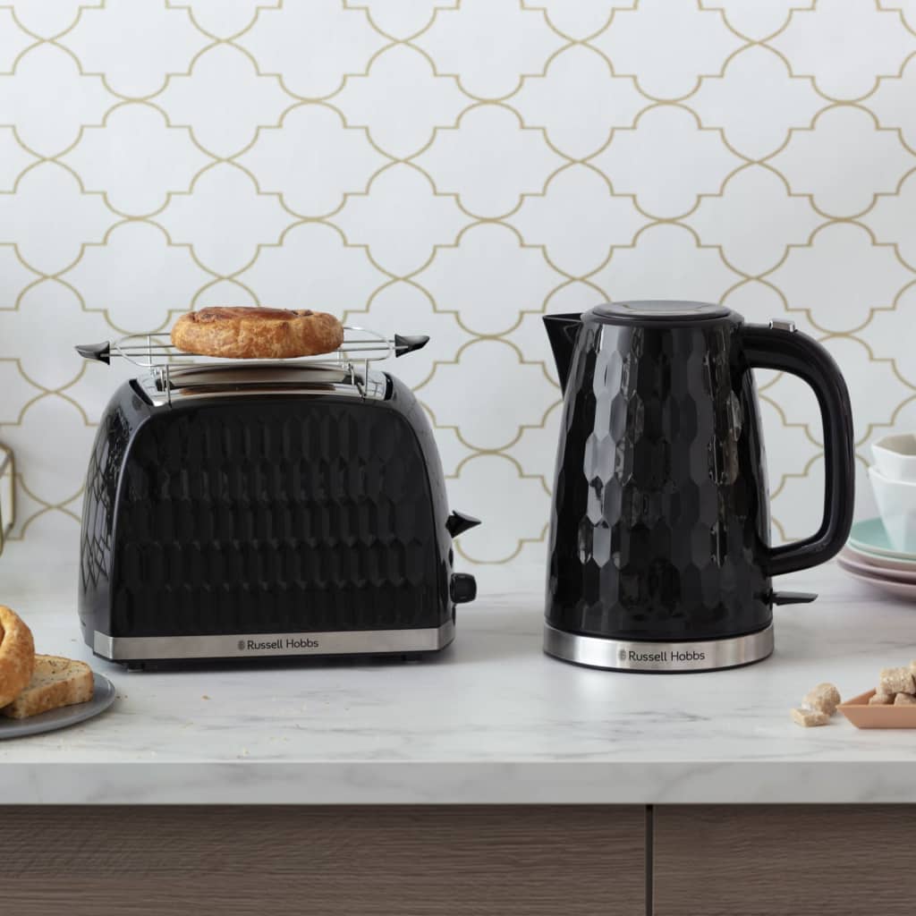 Offrez à votre cuisine un look tendance avec le grille-pain deux fentes Honeycomb de Russell Hobbs. Non seulement il aura fière allure dans votre cuisine, mais il vous offrira de multiples fonctions des plus pratiques. En effet, sa fonction de surélévation du pain permet de récupérer ses tartines sans se brûler et sa grille réchauffe viennoiseries est la solution idéale pour maintenir ses croissants au chaud. Adoptez un design affirmé dans votre cuisine avec le grille-pain 2 fentes Honeycomb noir doté d’un design texturé et de touches d’inox.Dans son revêtement en plastique noir premium au motif inspiré des nids d’abeille, c’est l’accessoire parfait pour une cuisine tendance. Grâce à la fonction surélévation du grille-pain Honeycomb, soulevez vos toasts du grille-pain sans effort et surtout sans vous brûler les mains. En effet, retirez facilement et en toute sécurité vos toasts des fentes, cette fonction prend soin non seulement du bout des doigts, mais aussi de la commodité à l'heure du petit-déjeuner. Besoin de maintenir votre pain au chaud pendant que vous préparez le reste de votre petit-déjeuner ? Ou peut-être avez-vous envie de réchauffer votre viennoiserie préférée ? Le réchauffe viennoiseries du toaster 2 fentes Honeycomb sera l’allié parfait pour vos matins gourmands.