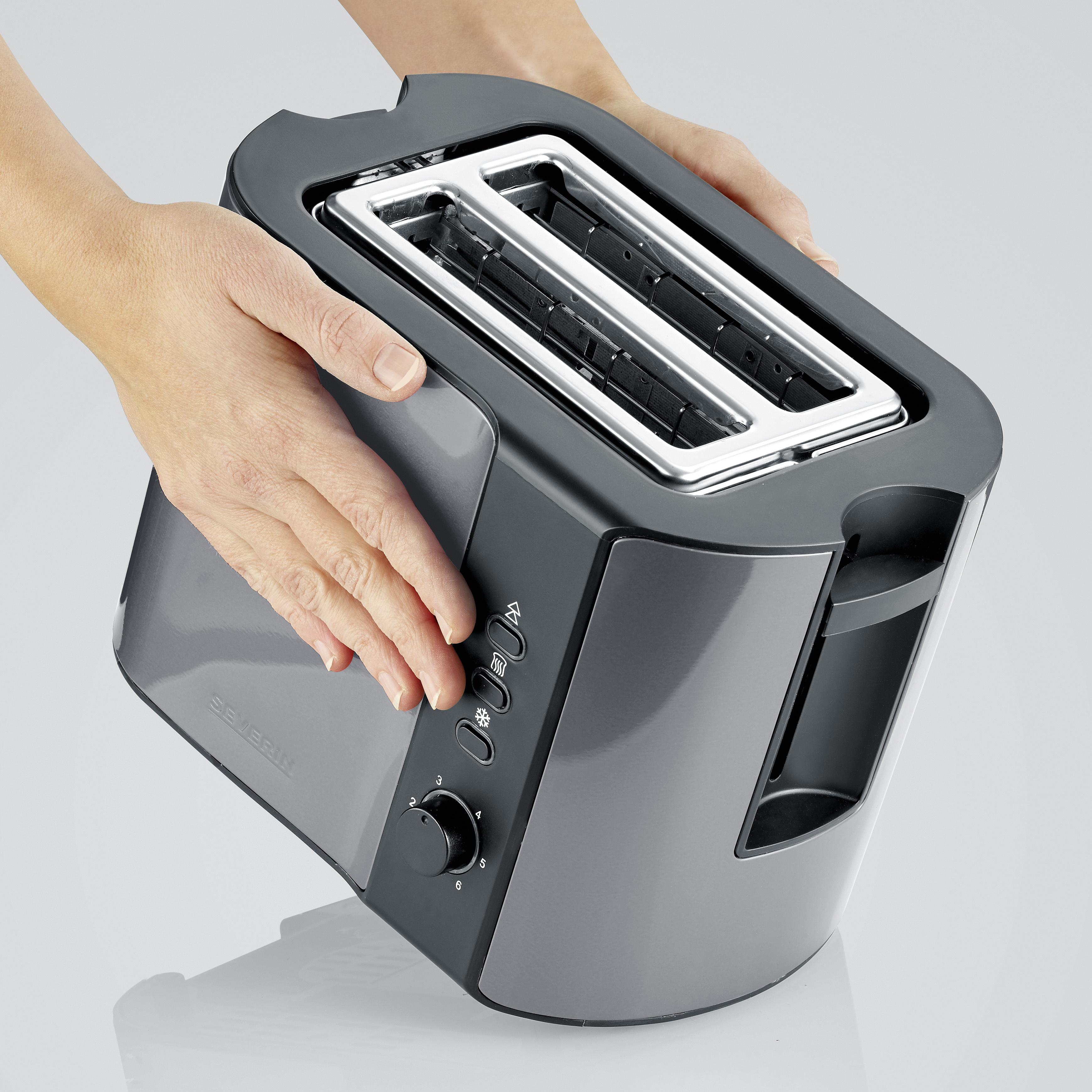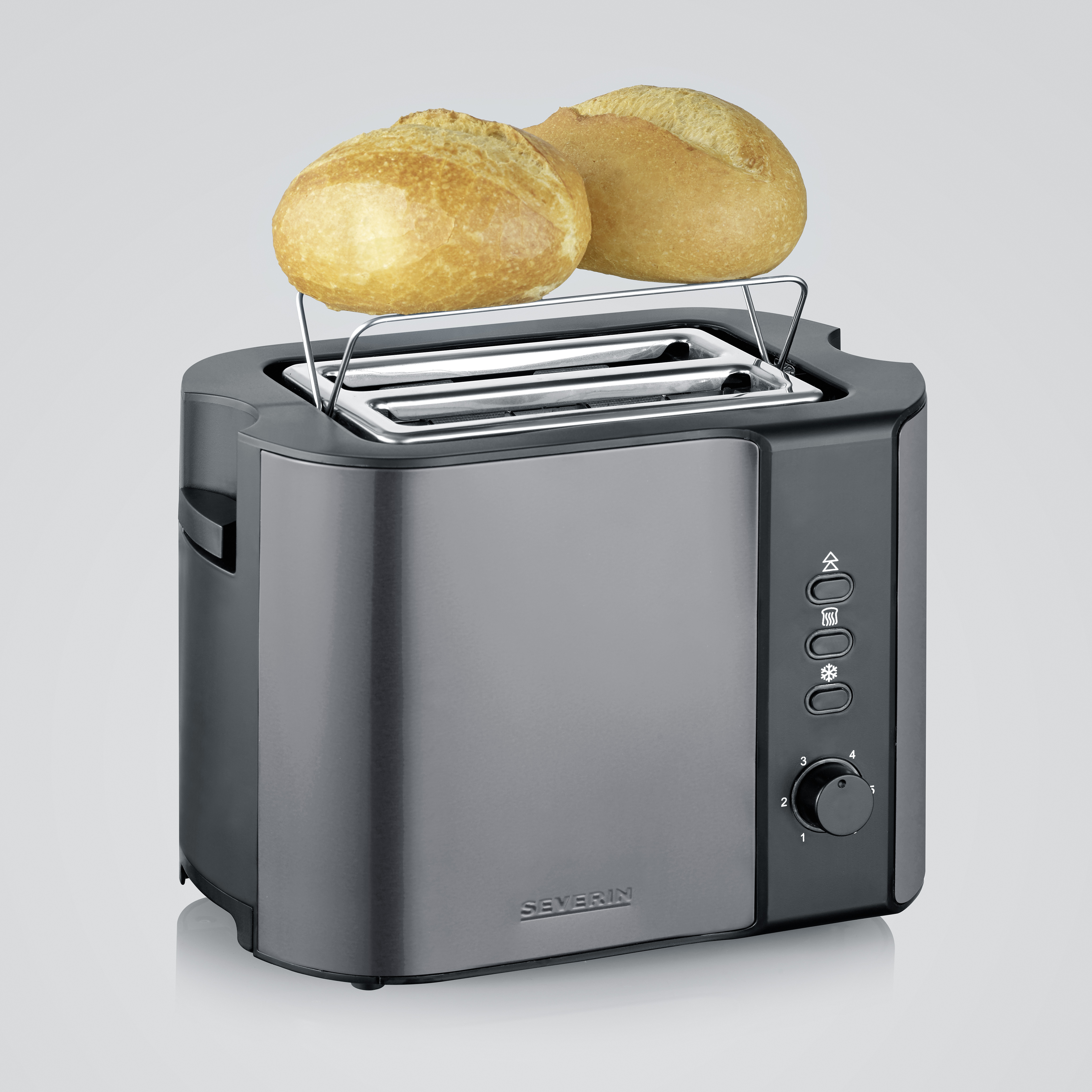 Boîtier en acier inoxydable de haute qualité et isolant de la chaleur Centrage des tranches de pain pour un brunissage uniforme des deux côtés du pain Grille-pain intégré pour une préparation facile des petits pains Niveau de dégivrage et niveau de réchauffage sans brunissage supplémentaire avec voyant de contrôle Puissance : env. 800 W