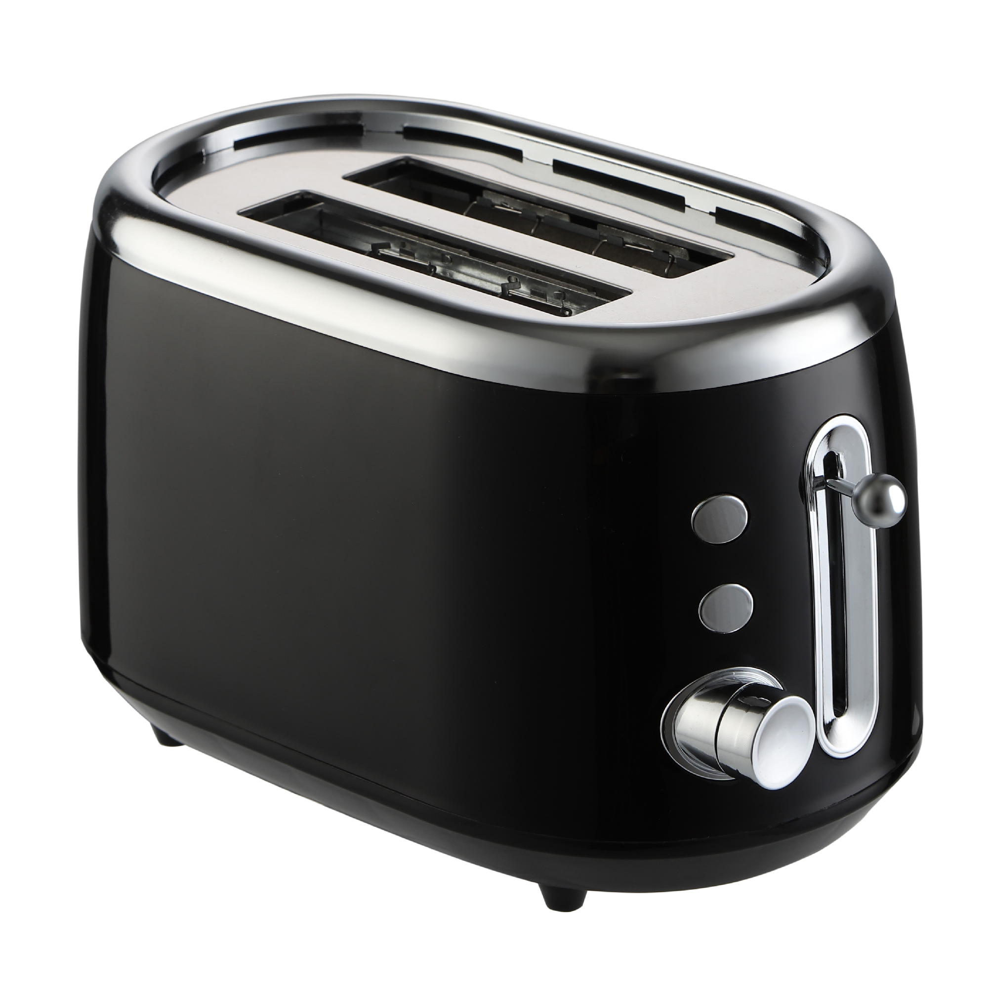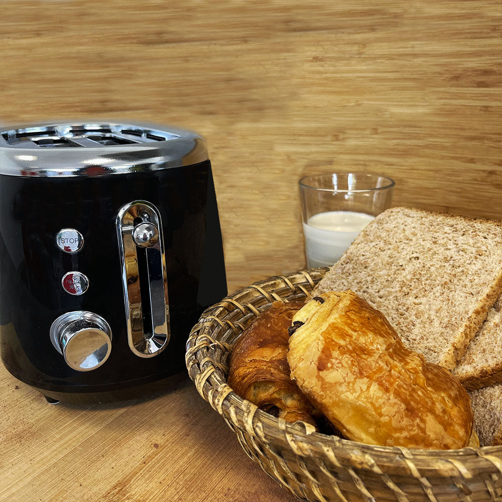- Grille pain toaster design rétro vintage élégant associé à un noir intense, rehaussé par des finitions en acier brillant.