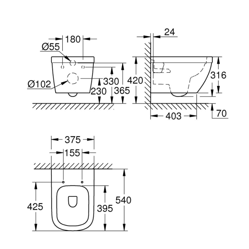 Caractéristiques techniques de la cuvette WC suspendue Euro Ceramic GROHE