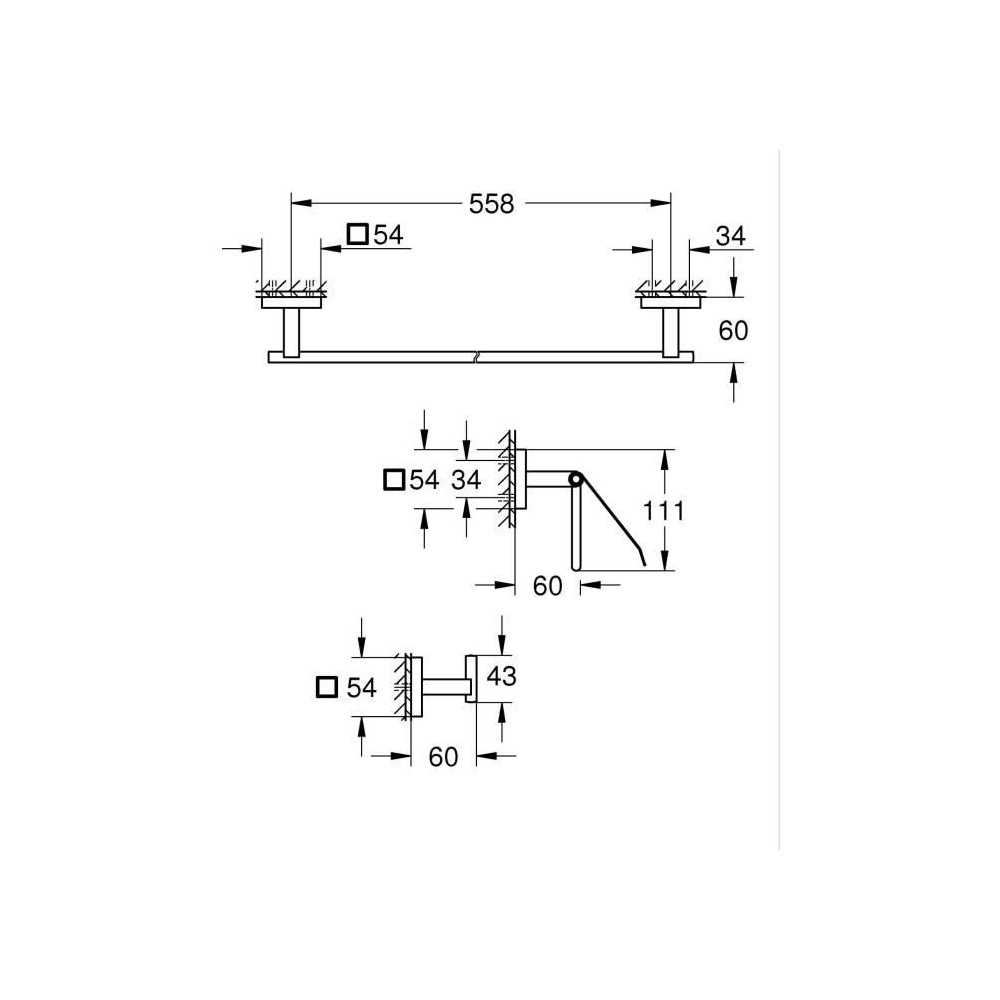 | Dimensions (cm) | Porte-serviettes longueur totale 600 mm, entraxe 558 mm; Plaques murales 54 x 54 mm; Hauteur porte-papier 111 mm; Projection éléments env. 60 mm; Crochet longueur depuis la plaque 43 mm |
