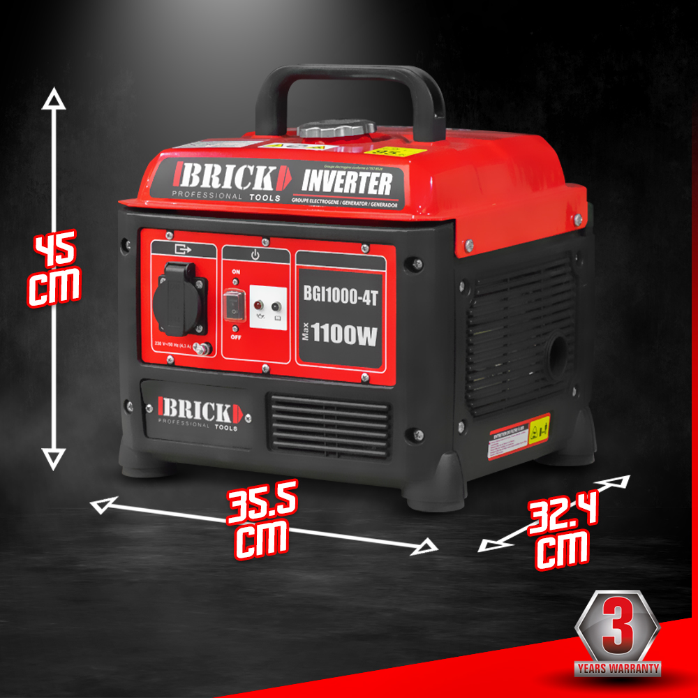 Ce groupe électrogène inverter max 1100W de la marque Brick est équipé d'un moteur 4 temps refroidi par air de 54 CC. Il possède une autonomie maximale de 4.6 heures. Il dispose d'un design compact, moderne et robuste. Pour votre sécurité, il possède un arrêt automatique en cas de surcharge.
