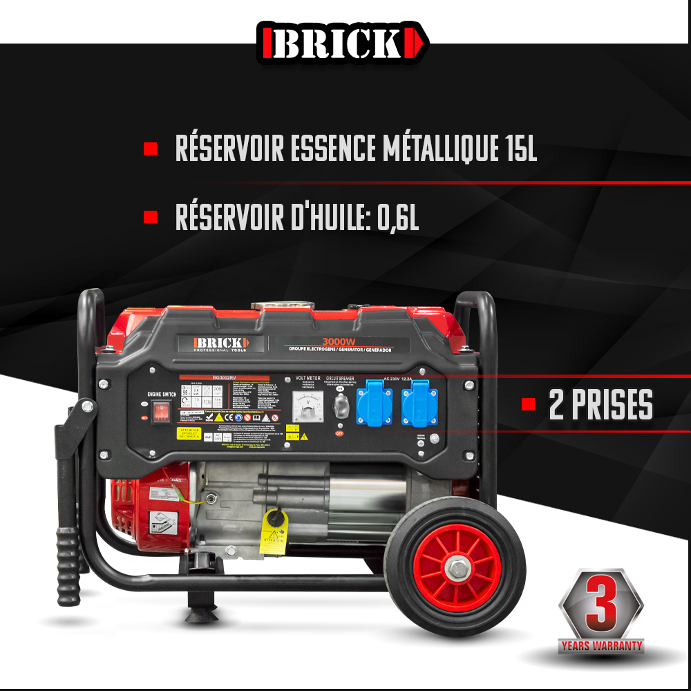 | Libellé | Groupe électrogène max 3000W avec roues - 2 prises - AVR - Essence - Brick |