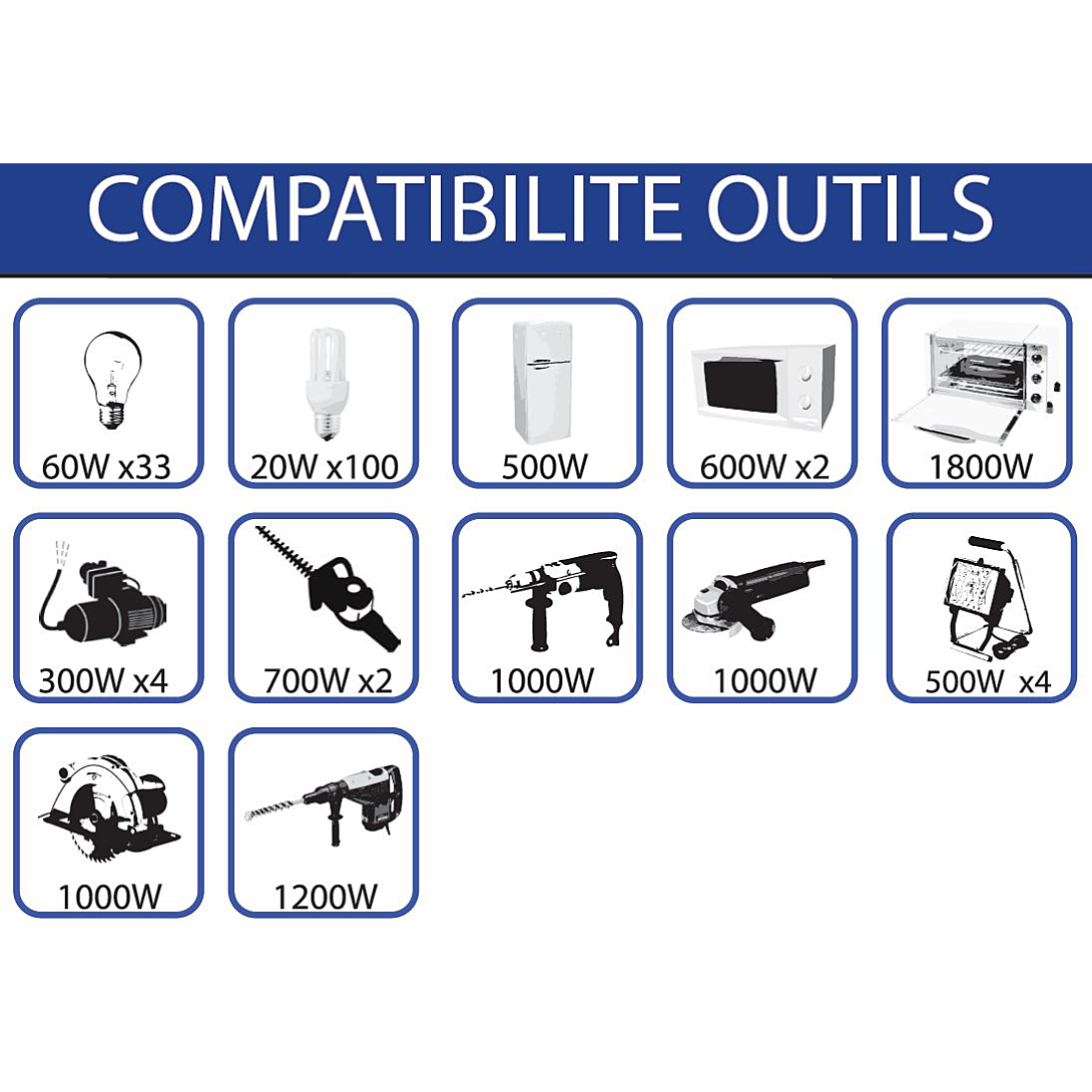 Mercure - Groupe électrogène 2400W 4 temps 15L - MC 2500 Groupe électrogène Mercure MC2500, idéal pour bricolage, petit chantier, camping car/caravaning, stand marche de nuit, éclairages soirées extérieures. Les avantages de ce groupe électrogène Mercure MC2500 sont : - Fonctionne au SP95/98/SP 95 E10 - Réservoir de 15L procurant une autonomie de 10h30 (à 75%) - Faible niveau de bruit : 65 db à 7m - Système AVR (régulation de la tension) - Protection contre les surcharges et sécurité si niveau d'huile faible