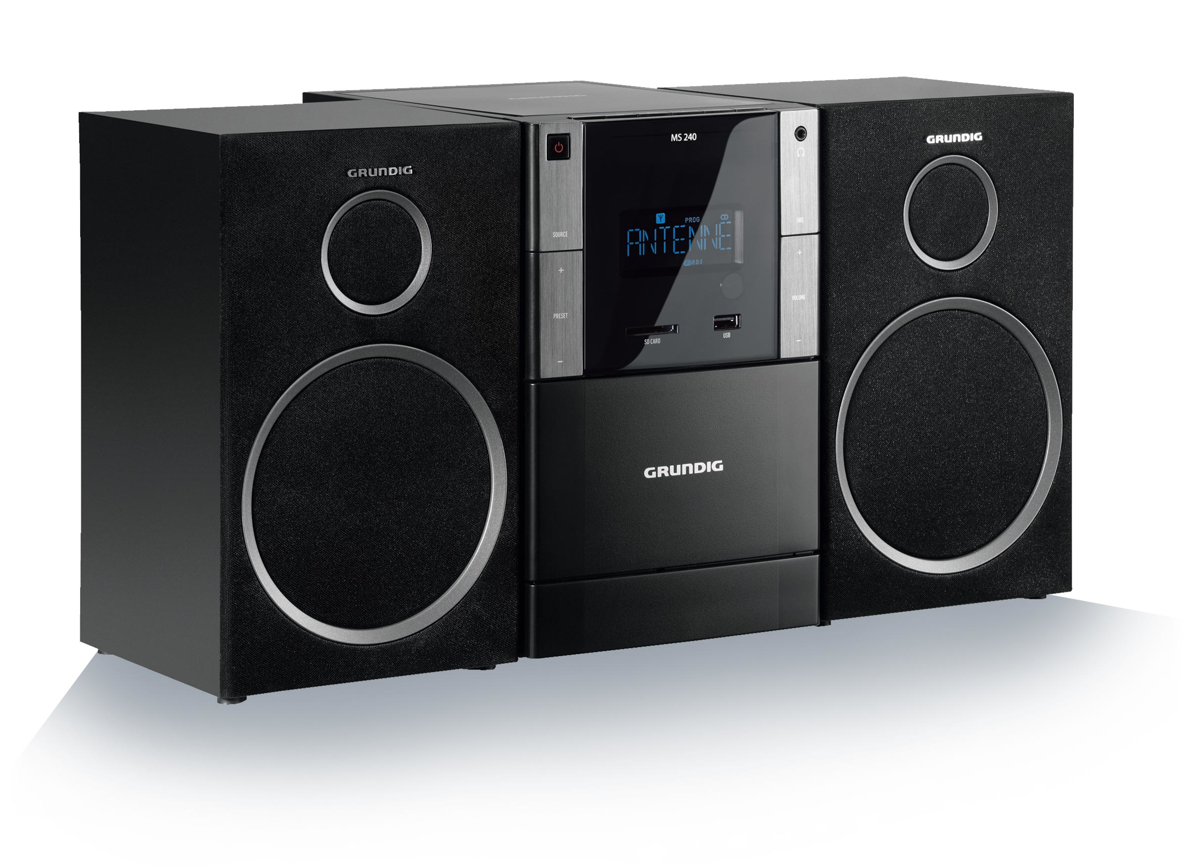 Grundig MS 240. Type: Système micro audio domestique, Couleur du produit: Noir, Nombre de disques optiques: 1 disques. Type d'écouteurs: 2-voies, Impédance: 8 Ohm, Puissance de crête en sortie (PMPO): 60 W. Type de bandes supportées: FM, PLL. Type d'écran: LCD. Casque connection: 3,5 mm