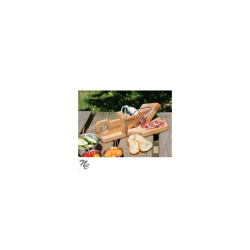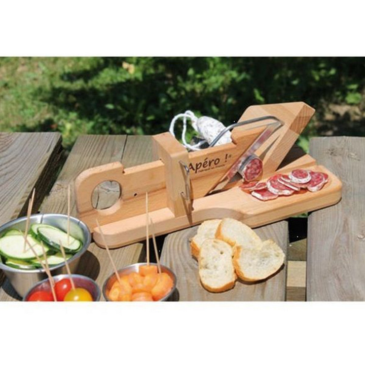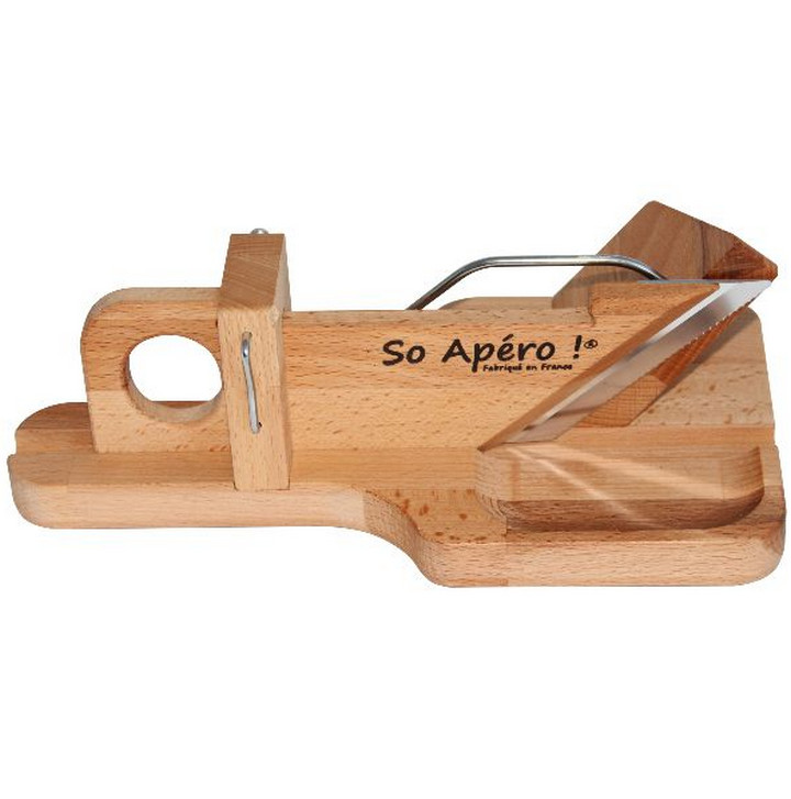 110115 - guillotine à saucisson - Guillotine à saucisson & charcuterie So Apéro 110115. Un véritable outil conçu pour la découpe du saucisson et des saucisses ! Toujours prête à l'emploi, cette guillotine à saucisson vous permet de couper sans effort et en tranches régulières toutes sortes de charcuterie, saucisson artisanal, saucisse sèche, chorizo, .... Elle deviendra vite la star de vos apéros entre amis ! En hêtre brut non traité et non teinté afin de respecter les produits alimentaires d'un point de vue bactériologique et gustatif. Lame en inox de coutellerie trempée et crantée.