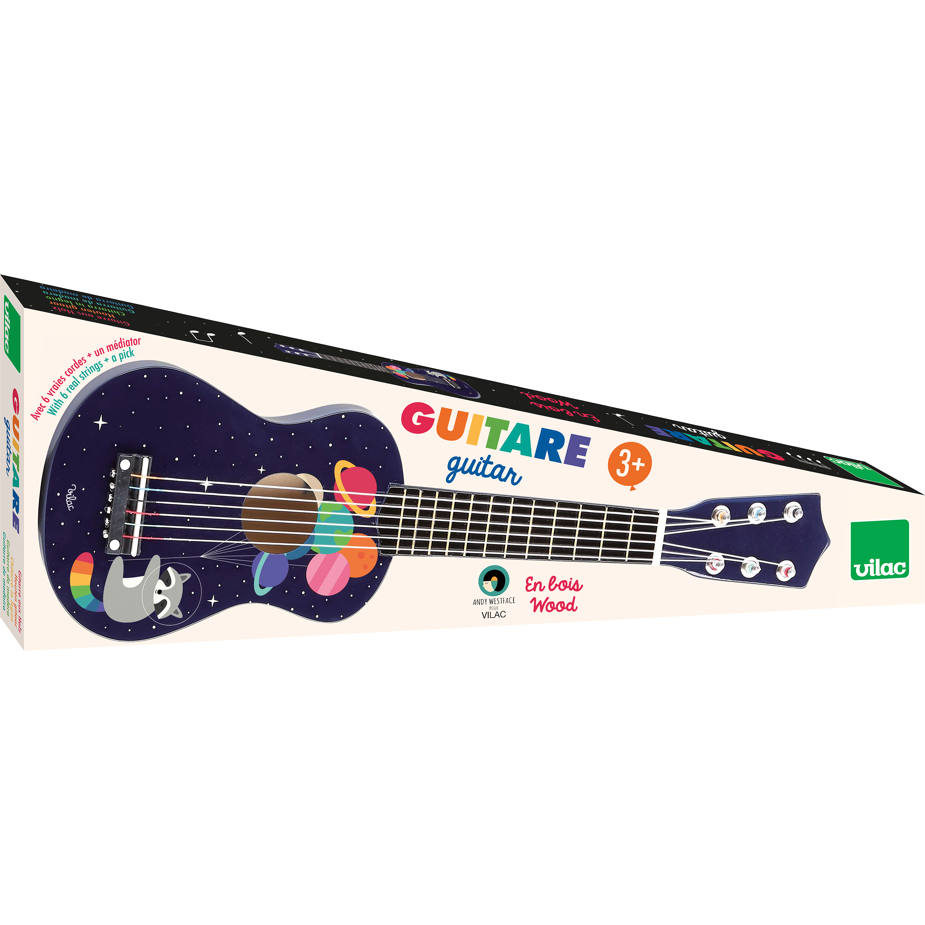 On rêve tous un jour de devenir une star internationale et de faire un incroyable solo de guitare devant ses fans ! Nos jouets sont aussi conçus pour déclencher des passions. Sans avoir la prétention d'être un instrument de musique aux notes parfaitement ajustées, cette guitare-jouet très poétique illustrée par l'artiste Andy Westface est adaptée pour les enfants dès 3 ans afin qu'ils fassent comme les grands. Bientôt les plus grandes salles de spectacles :-) !