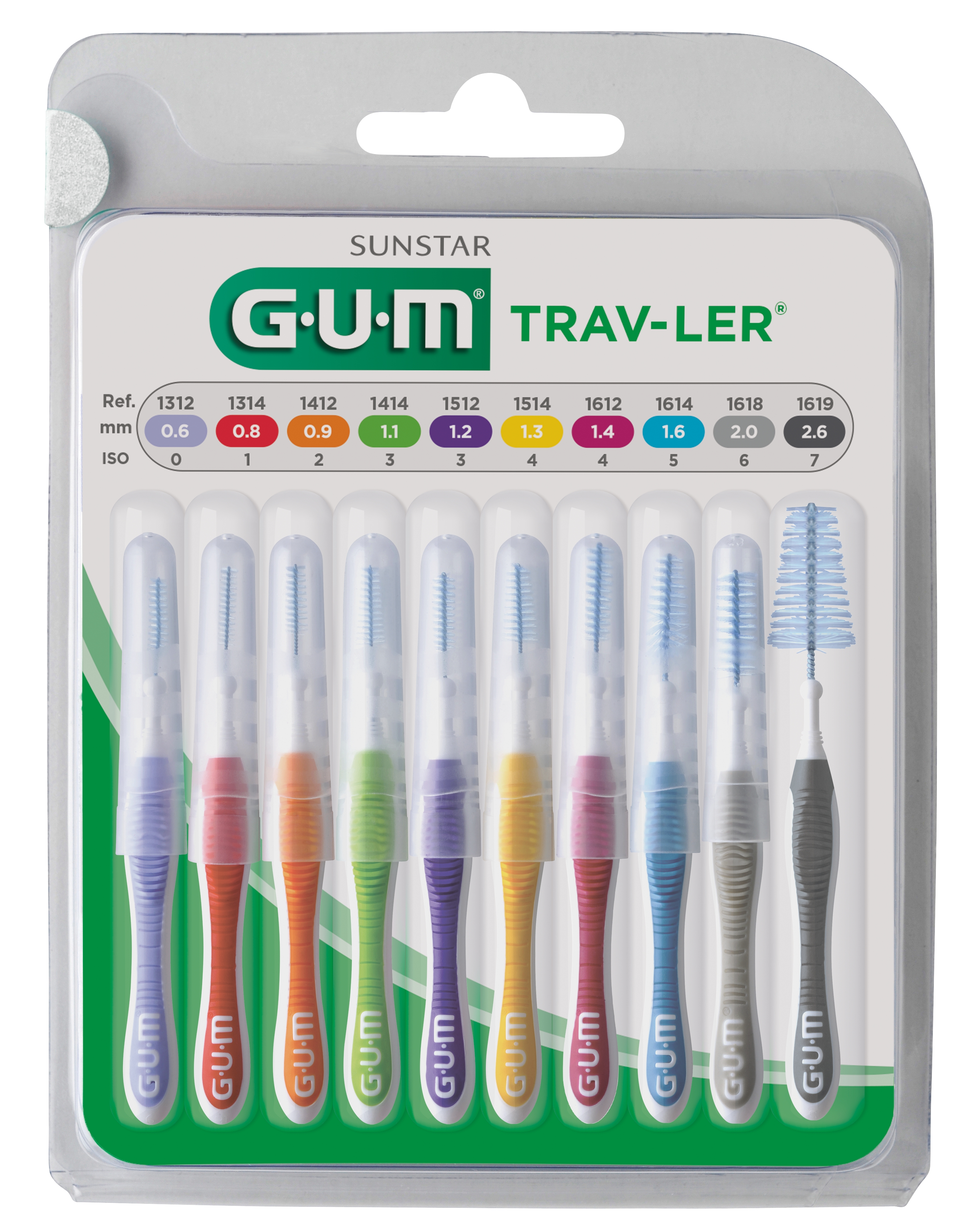 Blister contenant les 10 tailles de brossettes interdentaires GUM® TRAV-LER® ayant pour caractéristiques : Forme triangulaire des brins pour une élimination de la plaque jusqu’à 25% supérieure par rapport à un brin de forme classique Brins imprégnés d’un agent anti-bactérien Tige plastique coudable pour faciliter l’accès aux espaces interdentaires postérieurs Forme cylindrique ou conique Passage dans un espace allant de 0.6 mm à 2.6 mm de diamètre selon la brossette (selon la classification des normes ISO votée en 2006) Capuchon évitant la contamination des brins et servant d’extension au manche