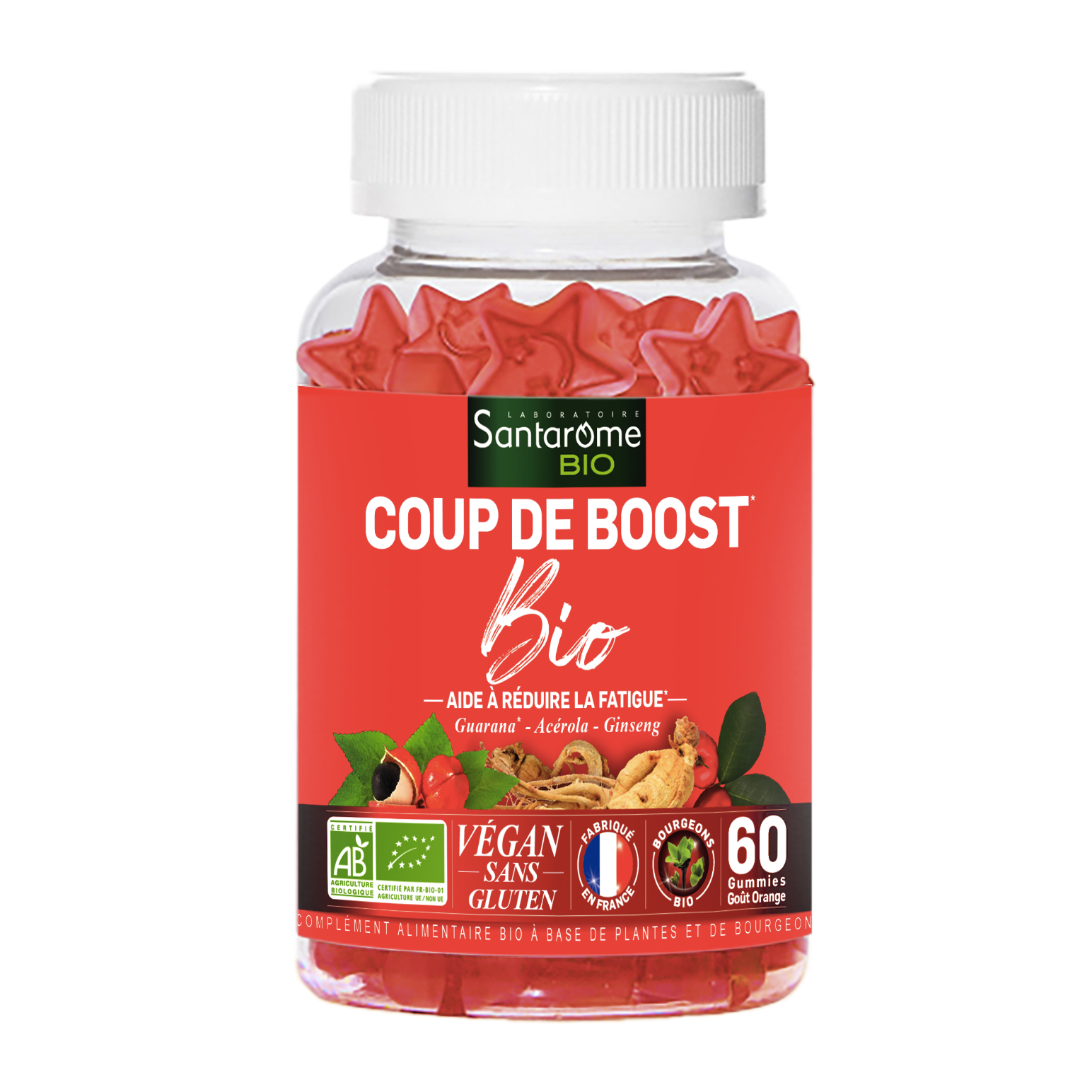 Ingrédients : sirop de glucose Bio** - sucre de canne Bio** - poudre de jus du fruit d'acérola Bio** (Malpighia glabra L.) - agent gélifiant : pectine - concentré de potiron Bio** et pomme Bio**- acidifiant: acide citrique - macérat glycériné de bourgeon de feuille de cassis Bio** (Ribes nigrum L.), macérat glycériné de jeune pousse de romarin Bio** (Rosmarinus officinalis L.), macérat glycériné de jeune pousse de séquoia Bio** (Sequoiadendron giganteum (Lindl.) J.Buchholz) - extrait sec de graine de guarana Bio** (Paullinia cupana Kunth) - extrait sec de racine de ginseng Bio** (Panax ginseng C.A. Meyer) - arôme naturel d'orange Bio** - jus concentré de carotte violette Bio** - acidifiant: citrate de sodium - agent d'enrobage: cire de carnauba Bio**