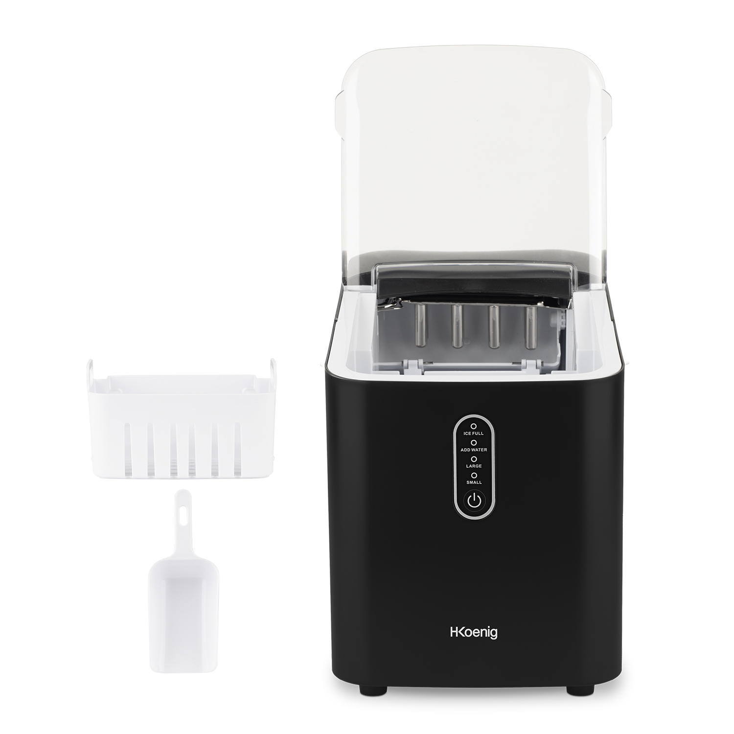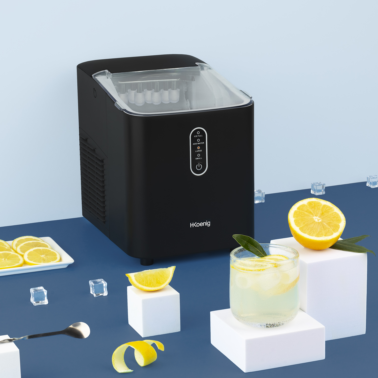La machine à glaçons KUB14 H.Koenig est l’appareil parfait pour rafraîchir vos boissons de l’été. Rapide, l’appareil produit 8 glaçons toutes les 7 à 9 minutes et jusqu’à 12kg par jour. La production de glaçons est automatique et est facilement contrôlable grâce à son affichage LCD intégré et son couvercle transparent. Utile, vous pouvez choisir parmi deux tailles de glaçons selon vos besoins. Servez-les facilement grâce à sa pelle à glaçons fournie ou son bac à glaçons amovible. Idéale, la KUB14 vous permettra aussi de remplir les glacières, essentielles pendant les soirées et les pique-niques de cet été. Très compact, la KUB14 se rangera facilement et n'encombrera pas votre plan de travail.