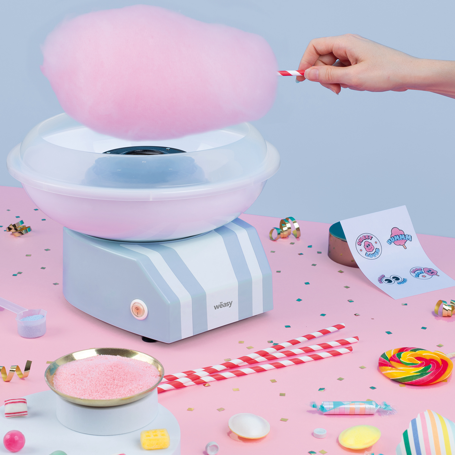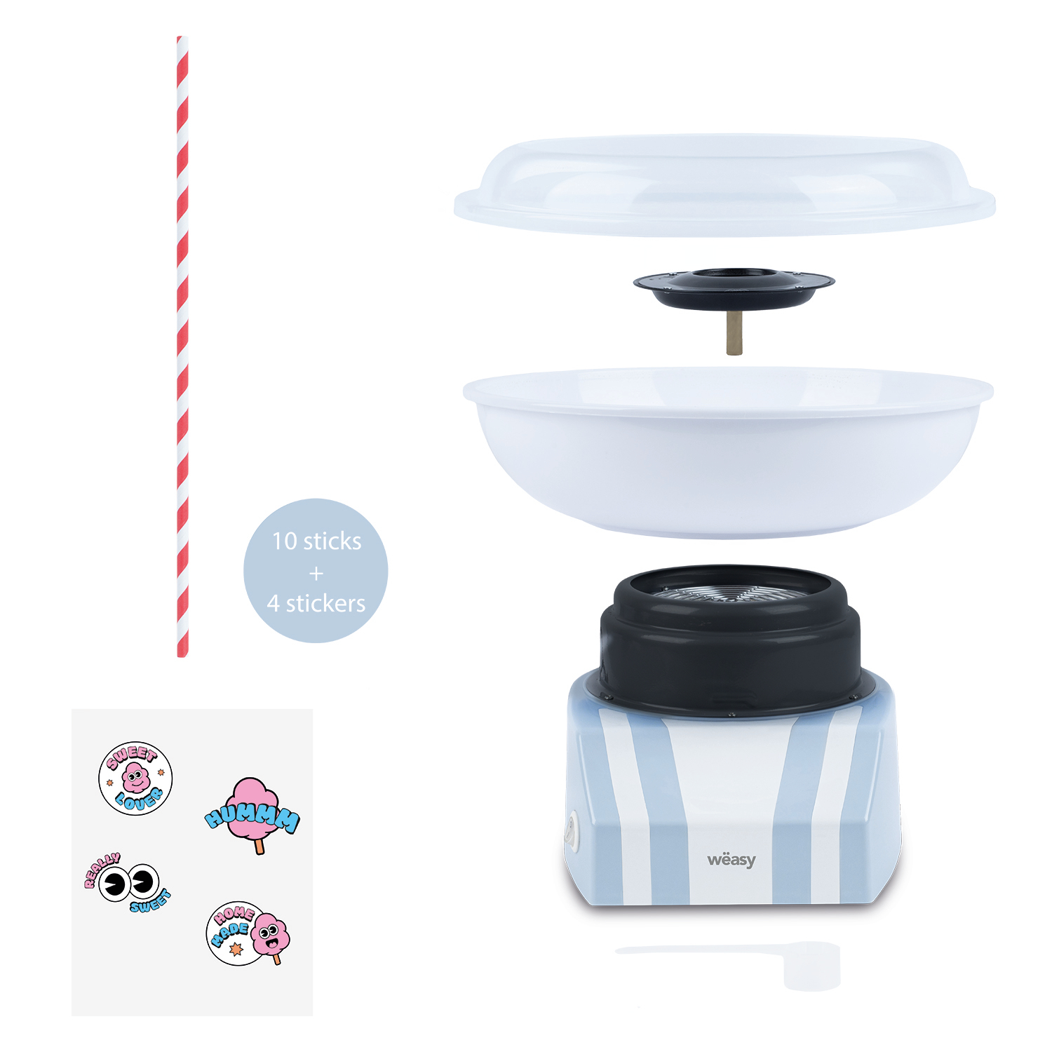 Profitez d'une barbe à papa faite maison avec notre SWEE32. Ergonomique et pratique, sa cuve amovible et son revêtement non collant permettent un nettoyage facile. Grâce à son support antidérapant, éliminez tout risque de chute ou d'instabilité, vous pourrez préparer vos barbes à papa avec vos enfants ! Personnalisez et customisez votre machine grâce à sa planche de 4 stickers. Elle s'accompagne aussi d'une cuillère de mesure pour plus de précision ainsi que de 10 batônnets en papier pour préparer vos barbes à papa et impressionner vos invités tout en partageant un moment convivial. La machine à barbe à papa SWEE32 de Wëasy vous permet de profiter de plaisirs sucrés comme vous les aimez !