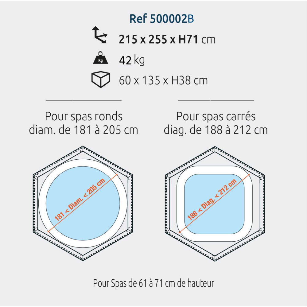 | Informations complémentaires | Pour spa gonflable rond de 181 à 205 cm ou spa gonflable carré de 188 à 212 cm de diagonale , Hauteur 61 à 71 cm |
