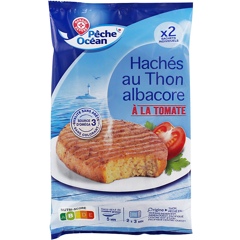 PRÉPARATION PRÉCUITE ET PRÉFRITE À BASE DE THON ALBACORE** ET DE COLIN D’ALASKA** HACHÉS À LA TOMATE ** Qualité sans arête : bien qu'un soin tout particulier ait été pris pour éliminer toutes les arêtes, quelques-unes peuvent exceptionnellement se retrouver dans ce produit. PECHE OCEAN