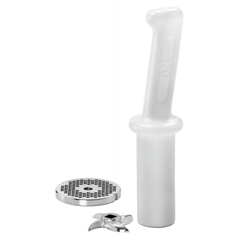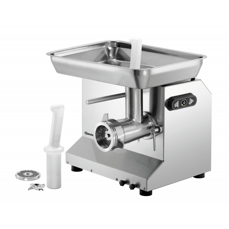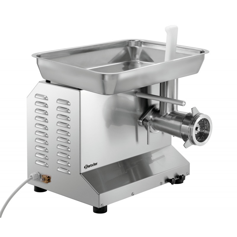 Hachoir à viande Bartscher | Hachoir à viande électrique professionnel de la marque Bartscher. Pour la préparation de grandes quantités de viande jusqu'à 200 kg par heure. L'appareil puissant convainc également en combinaison avec la presse à hamburger FW200 disponible en option. Puissance : 1,47 kWTension : 230 V Fréquence : 50 Hz Raccord d'appareil : Prêt à être branché Capacité max. : 200 kg / hMarche arrière : oui Système Unger : non Entonnoir du moulin amovible: oui Dispositif de mouture amovible : oui Unité de coupe amovible : Oui Moteur ventilé : oui Protection contre la surcharge : non Interrupteur de marche/arrêt : oui Témoin lumineux de contrôle : Marche/arrêt - marche avant - Marche arrière Couleur : Argenté Propriétés : Tous les accessoires en acier inoxydable sont lavables au lave-vaisselle Compris : 1 disque perforé 4,5 mm - 1 lames en acier inoxydable, à 4 ailes - 1 poussoir Diamètre de l'orifice de remplissage : 50 mmDiamètre des disques: 82 mm Matériau de l'entonnoir du moulin : Acier inoxydable Matériau du réducteur : Acier inoxydable Matériau : Acier inoxydable Largeur : 500 mmProfondeur : 435 mmHauteur : 445 mmPoids : 32,0 kg