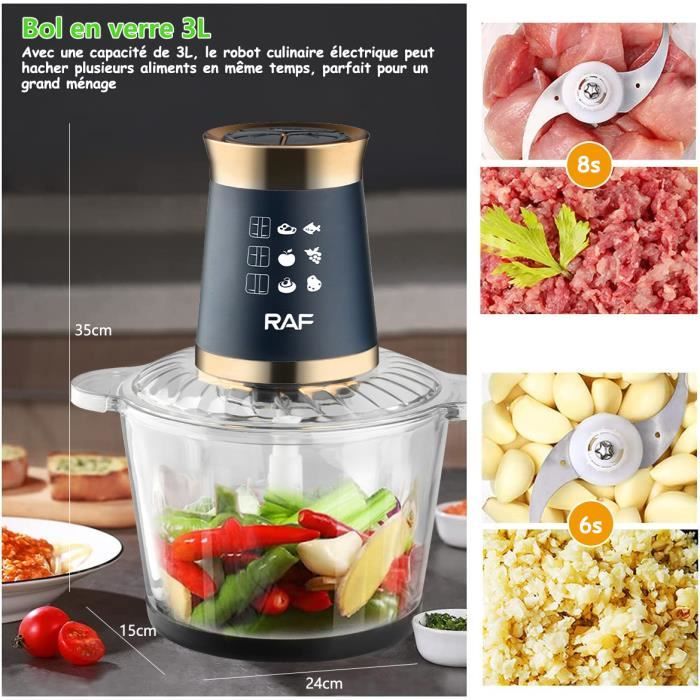 | Libellé | Hachoir Électrique 3L Bol Verre - 800W Hachoir à Viande 3 Niveaux de Vitesse - 4 Lames Amovibles pour Hacher Viande Légumes Rapide |