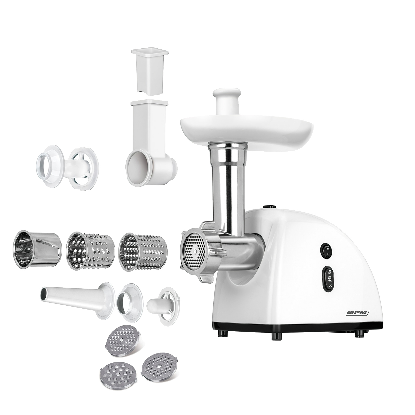 | Libellé | Hachoir électrique à viande avec poussoir à saucisses 3 disques de coupe 720 Blanc MPMMMM-06 |