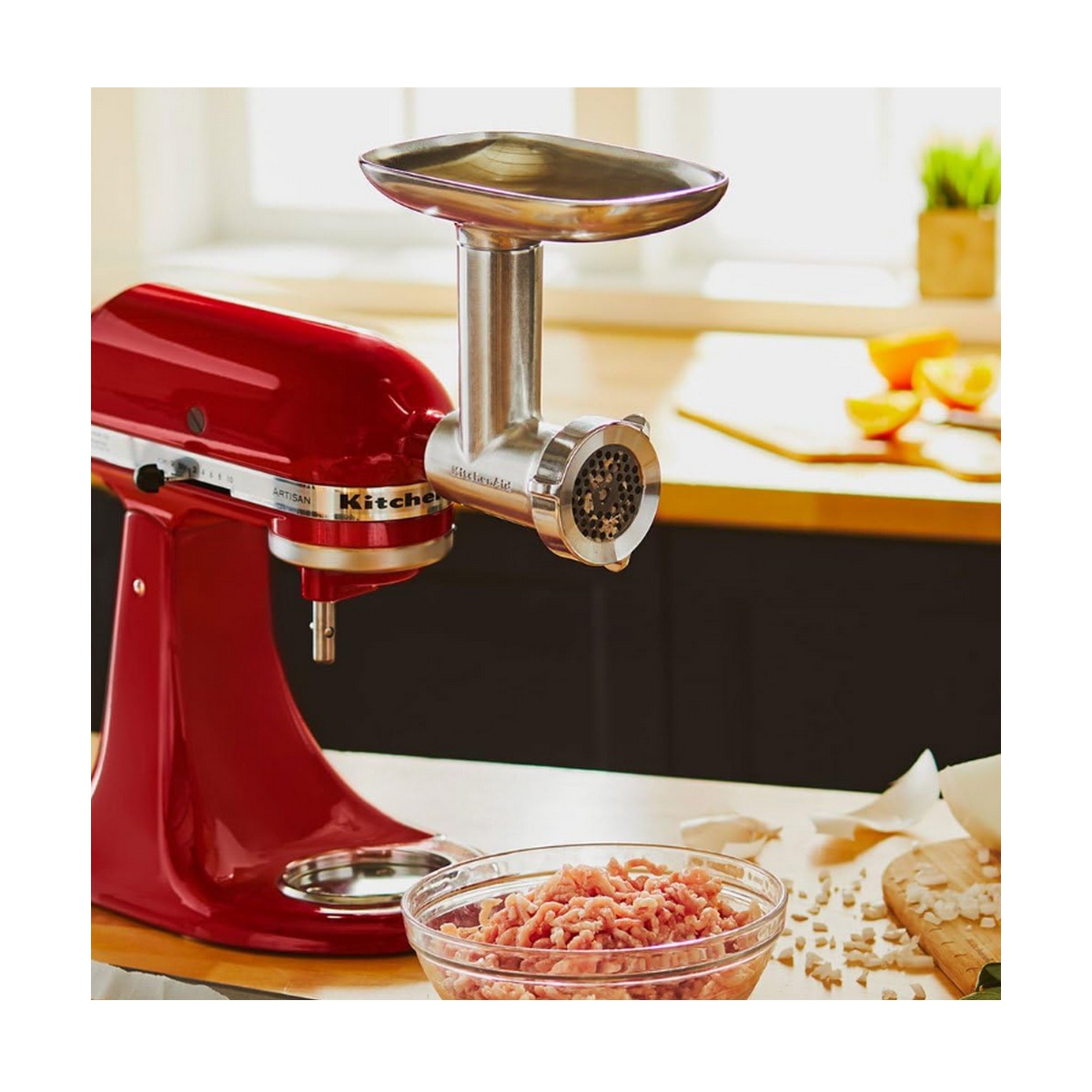Accessoires pour Robot Pâtissier multifonction KitchenAid. Hachoir à viande avec poussoir à saucisse. S'adapte sur toute la gamme de Robot Pâtissier de la marque KitchenAid.