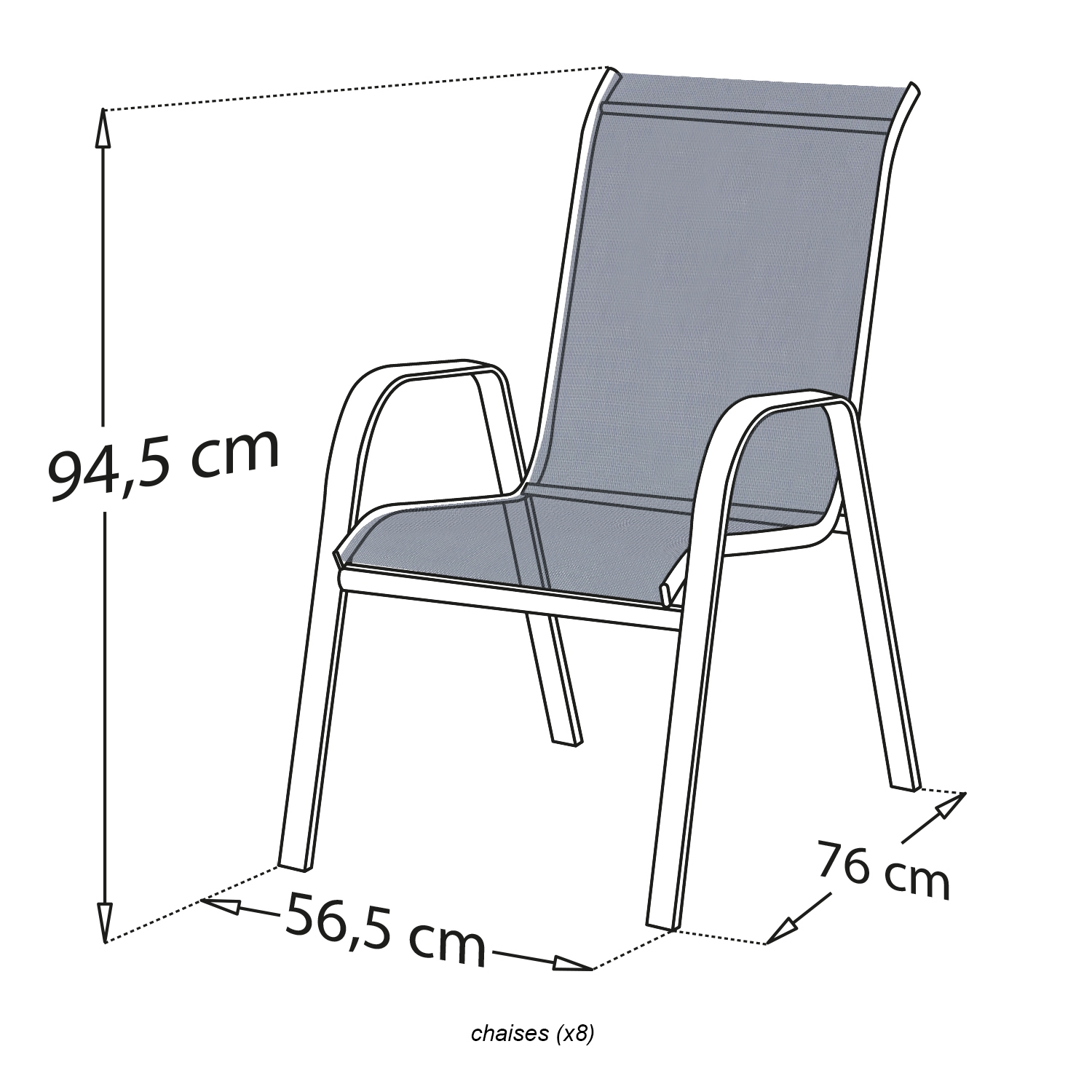 Les chaises MARBELLA donnent une touche moderne à votre extérieur grâce à un design et des couleurs tendance. Même si vous êtes plutôt à la recherche de chaises pour votre salon ou votre cuisine, ce modèle pourra également s'intégrer à merveille à votre mobilier d'intérieur.L'association des coloris noir de l'assise et du gris de la structure est harmonieuse et l'alliance des matières textilène et aluminium est parfaitement dans l'air du temps.L'assise des chaises est en textilène, matière souple qui épouse très bien les formes de votre corps. De plus, le textilène est doté d'une aération étudiée pour que la peau respire quand il fait chaud. Le confort de ces chaises en textilène est tel que vous n'aurez pas besoin d'ajouter de coussins.Pratique, vous pouvez empiler ces chaises de jardin afin de les ranger facilement et les couvrir d'une bâche de protection pour une plus grande longévité. Les bâches sont également disponibles chez Happy Garden.