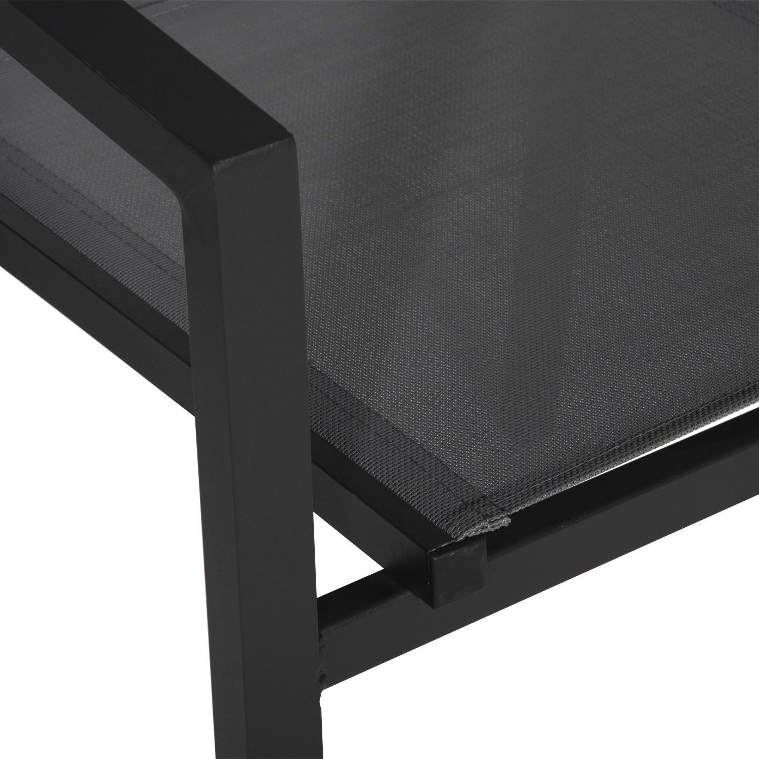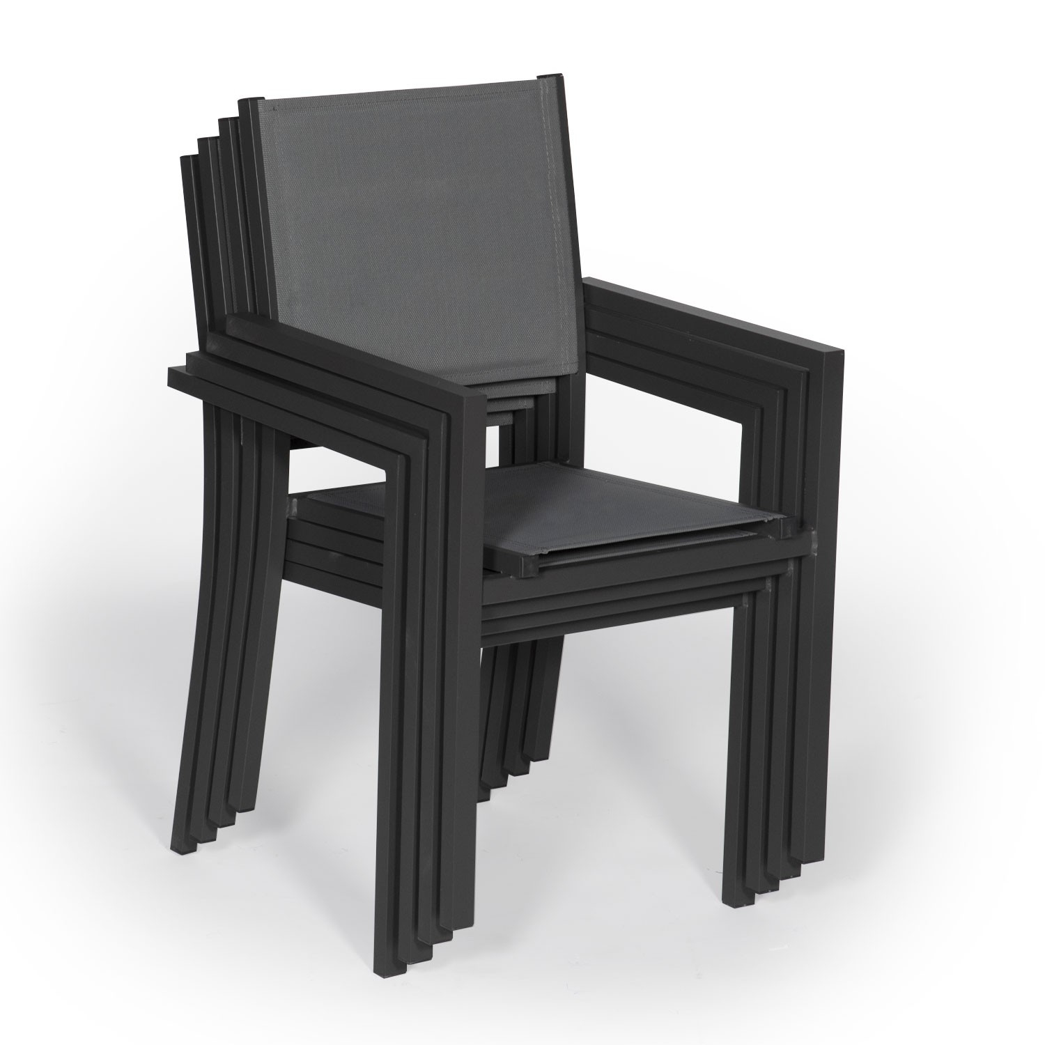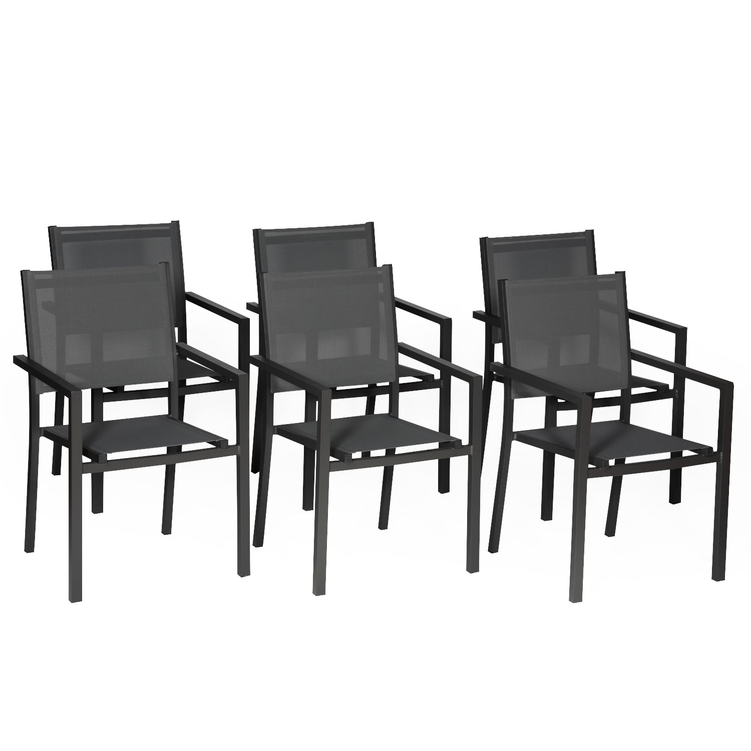 Misez sur un style sobre et élégant pour votre terrasse en adoptant ce lot de 6 chaises qui se mariera à la perfection à tous les salons outdoor.Les matières qui composent ces chaises seront idéales pour une utilisation extérieure : l'aluminium et le textilène sont robustes et résisteront aux rayons U.V. Pour votre plus grand plaisir, ce sont également des matières faciles à entretenir : une éponge et de l'eau savonneuse suffiront à rendre vos chaises comme neuves.Vous serez confortablement installé sur les assises en textilène car cette matière est souple et épouse les formes du corps, les petites alvéoles qui le composent laisseront votre peau respirer en cas de grandes chaleurs.Si vous souhaitez stocker vos chaises pendant l'hiver ou quand vous ne les utilisez pas, rien de plus simple car, en plus d'être très légères, elles s'empilent.Avec tous ces avantages, y a-t-il encore une raison d'hésiter ?