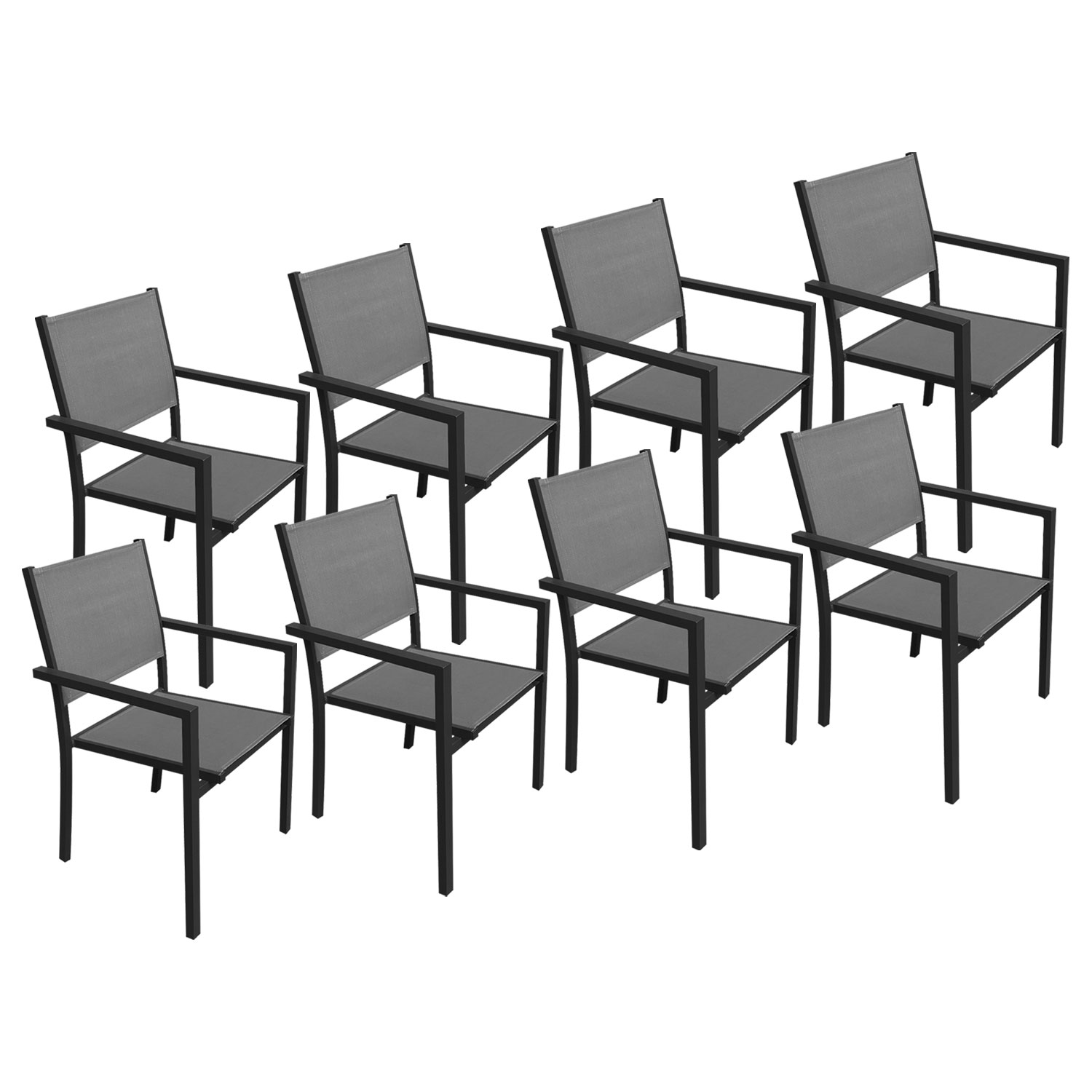 Votre terrasse vous réclame des chaises de jardin à la fois confortables, robustes et esthétiques pour passer un été en toute sérénité ? Happy Garden se charge de tout et vous propose le lot de 8 chaises de jardin qui réunit toutes ces qualités !Votre confort sera assuré par une assise en textilène, une matière souple qui épouse les formes de votre corps et qui laisse respirer votre peau en cas de fortes chaleurs grâce aux petites alvéoles qui le composent. Ces chaises sont très robustes : conçues en aluminium et en textilène, elles résisteront parfaitement à l'été. Pas un rayon U.V ne les feront flancher ! Enfin, avec leur ligne épurée et leurs coloris sobres et intemporels, ces chaises de jardin s'accorderont à tous les mobiliers outdoor et donneront un style très tendance à votre terrasse.Vous en voulez encore ? Happy Garden a également prévu de vous faciliter la tâche pour stocker ces chaises car elles sont légères et elles s'empilent. Et pour leur entretien, un petit coup d'éponge à l'eau savonneuse suffira à les rendre aussi belles qu'au premier jour.